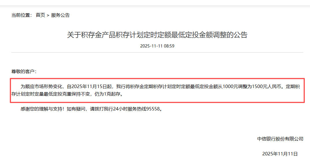 【 】 国际金价重回4100美元之后,银行再跟进调整积存金相关业务门槛。 11月11日,中信银行公告称,为顺应市场形势变化,自2025年11月15日起,将积存金定期积存计划定时定额最低定投金额从1000元调整为1500元人民币。定期积存计划定时定量最低定投克重保持不变,仍为1克起存。同日(11月11日),建设银行公告称,为保护投资者权益,修订了《中国建设银行个人黄金积存业务产品介绍及交易规则》,内容主要涉及交易报价、巨额赎回等事项。新版文本将于2025年11月15日(周六)正式启用。 其中,有关黄金积存计划的日积存起点金额由此前的1000元上调为1200元。值得关注的是,此次上述两家银行调整积存金业务门槛时机恰逢国际金价再度攀升。受访业内人士认为,综合近期银行业的一系列动作来看,上调积存金相关门槛大概率为了防范黄金市场风险。