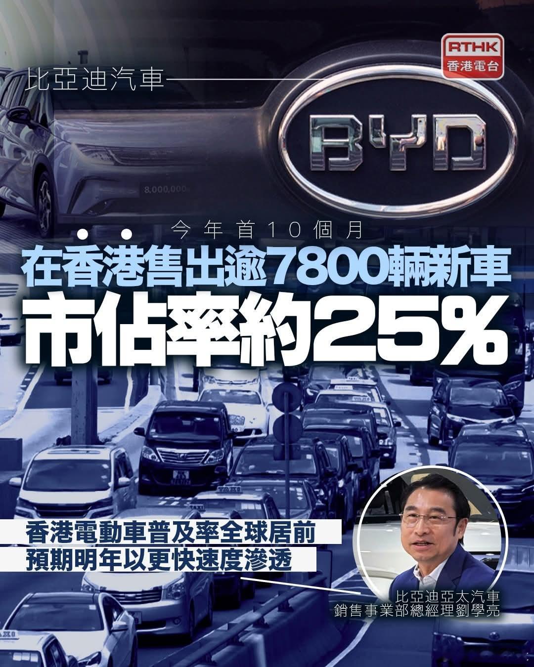 比亚迪:香港电动车普及率全球居前,料明年渗透速度更快比亚迪亚太汽车销售事业部总经理刘学亮表示,今年首十个月公司在香港售出逾7800辆新车,市占率约25%。他认为,香港电动车普及率全球居前,仅次于挪威,预期明年以更快速度渗透。他说,自2022年以来,公司累计在香港推出8款新能源车车型,认为布局应满足更多香港市民对电动车的需求,又指售价介乎30万至40万元的SUV车型在香港最受欢迎。政府上月底就「启德智慧绿色集体运输系统」合约公开招标。刘学亮说,公司曾与政府交流云巴技术,会积极参与招标。比亚迪今年3月于内地推出「兆瓦闪充」技术。刘学亮称,公司期望不同市场也能够使用有关技术,正在探讨在香港等市场推出,但强调目前无时间表。