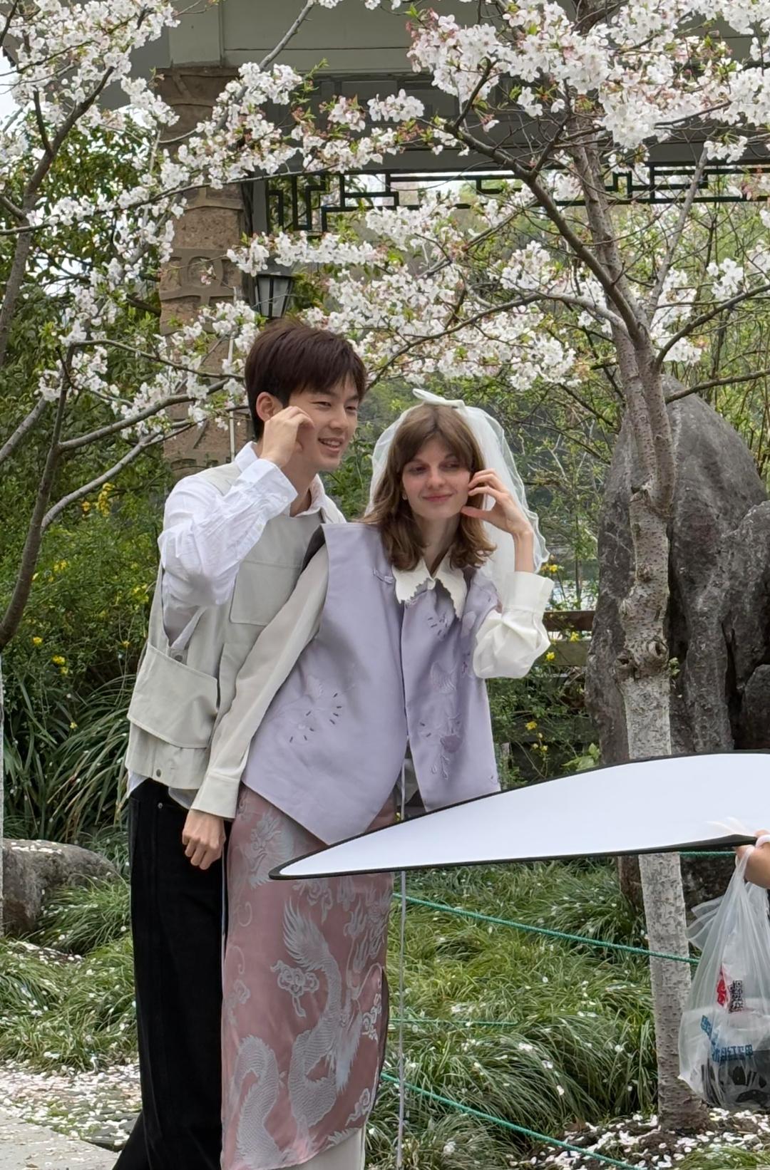 鲁迅公园樱花树下撞见董力和阿诺啦!落英铺了满长椅,他正笑着给她拢头纱,这画面太甜了。 董力还是当年那个“董大力”,白衬衫搭浅马甲,笑起来眼尾弯成月牙,少年感直接溢出屏幕;旁边的阿诺高高瘦瘦,粉裙配淡紫马甲,连发丝都飘着温柔气,就是瘦得让人心疼了点~ 也不知道是在拍节目还是约会,这樱花树下太浪漫,谁看了不说一句“这对好配”~