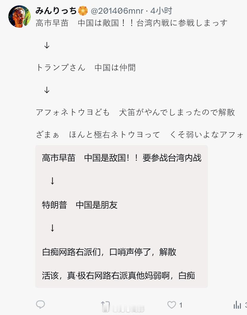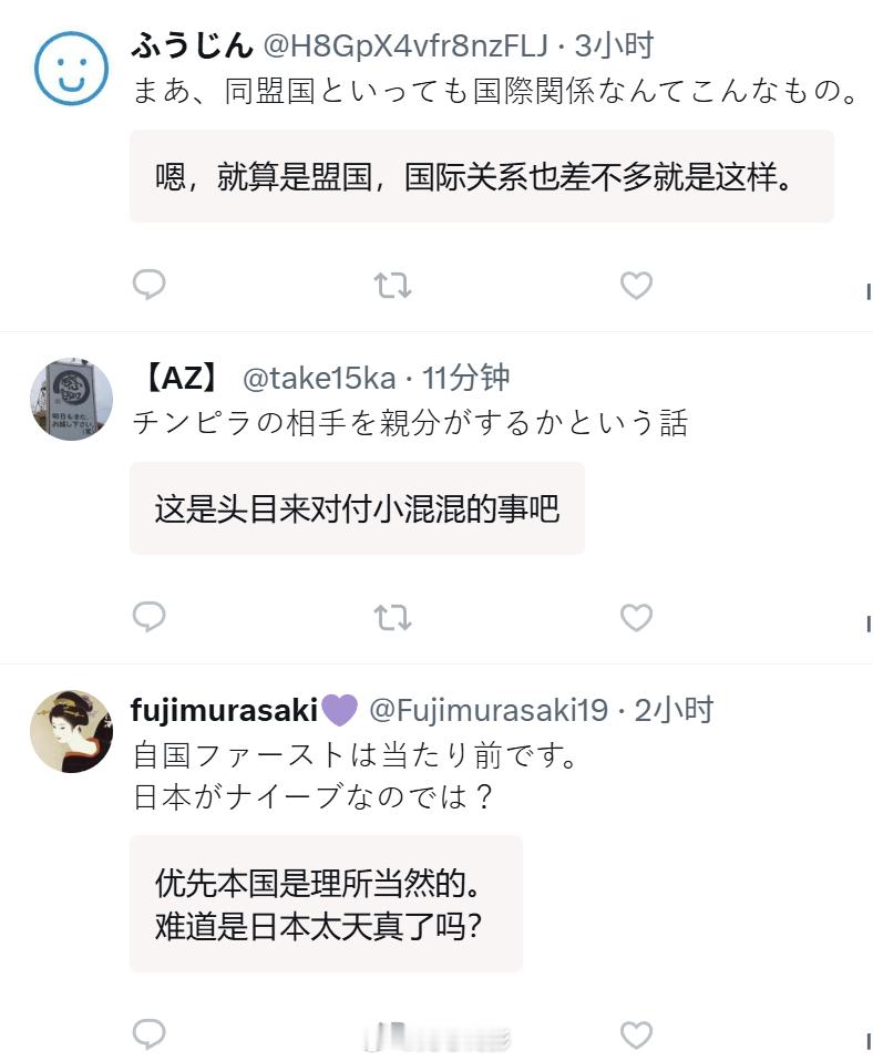 “美国难道让我们跟泽连斯基一样,只卖武器给我们,让我们自己去搞定中国?”日本媒体也报道了 ,一些日本人是非常失望的。要知道这几天日本人一直在强调的一个词就是“美日同盟”,他们认为一旦日本对中国开战,美国、英国、澳大利亚,新西兰等等一大圈“自由世界”的“盟友”就会来帮他们,结果现在看起来,居然连中国总领事这么“无礼”的事情都不帮日本人出头……