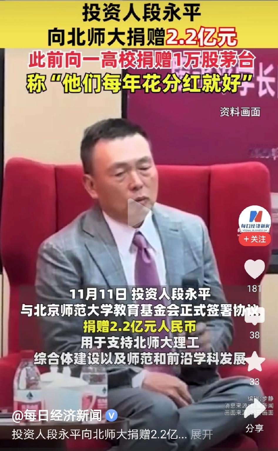 出生在江西南昌,现为美国国籍的段永平又给大学捐钱了!直接就是2.2亿! 北京师范大学是他母亲的母校,不得不说一所学校培养一个杰出校友的价值太大了。不但校友会回馈母校,他的后辈也会跟着回馈。这或许就是教育的另一层面价值!