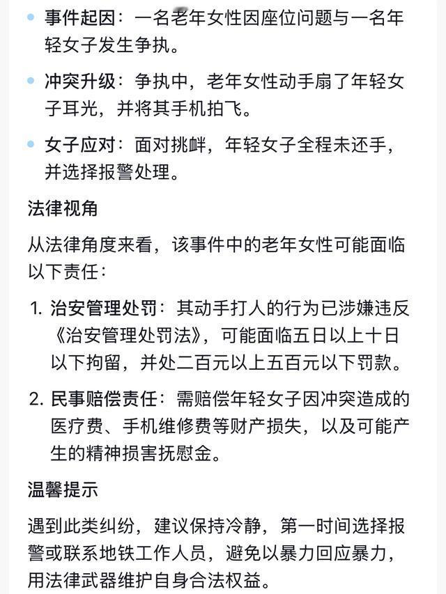 《地铁耳光事件:当“尊老”与“维权”在车厢里碰撞》 “啪!” 一记响亮的耳光突然在杭州地铁车厢炸开。年轻女孩的手机应声飞出,重重砸在车厢壁上,屏幕瞬间碎裂。打人的白发老太太喘着粗气,而挨打的女孩浑身发抖却未还手——这戏剧性的一幕被乘客拍下,瞬间引爆网络。 随着老太地铁打飞女孩手机登上热搜,评论区迅速分裂成两大阵营:有人怒斥“为老不尊”,也有人猜测“肯定有隐情”。但在这起看似简单的冲突背后,折射出的却是更深层的社会焦虑。 1. 监控还原:3分钟里的罗生门 警方通报显示,事件全过程仅持续180秒: 00:00 老太太踉跄上车,女孩专注玩手机未让座 01:23 老太太突然用雨伞戳女孩膝盖 02:17 女孩抬头说了句“您有事吗?” 02:59 耳光落下 “她瞪我那眼,跟我去世的儿媳一模一样。”老太太事后这样解释。而女孩则坚称:“我根本没见过她。” 2. 网络论战:代际冲突的火山口 事件引发两大阵营激烈交锋: “挺老派”观点 “现在年轻人对老人毫无敬畏” “让座是基本教养,活该被教训” (获赞3.2万) “护青派”反击 “暴力永远不是解决问题的办法” “道德绑架比耳光更可怕” 社会学家指出,这种争论本质是“资源争夺焦虑”——老年人用暴力捍卫正在流失的话语权,年轻人则反抗被强加的道德义务。 3. 隐忧浮现:老年心理健康危机 深入调查发现更严峻的问题: 涉事老太太独居10年,患轻度阿尔茨海默症 其病历显示曾5次因“幻视家人”就医 杭州60岁以上老人中23%存在心理问题 “这不是简单的道德事件,而是老年精神健康体系缺失的恶果。”心理医生沉重地说。 当我们在争论该不该让座时,或许更该问:为什么我们的老人活得如此孤独? “遇到类似情况,你会?” A. 立即让座避免冲突 B. 坚持不让但保持礼貌 C. 呼吁设置“爱心专座监控” 地铁辱骂事件 让座 尊老