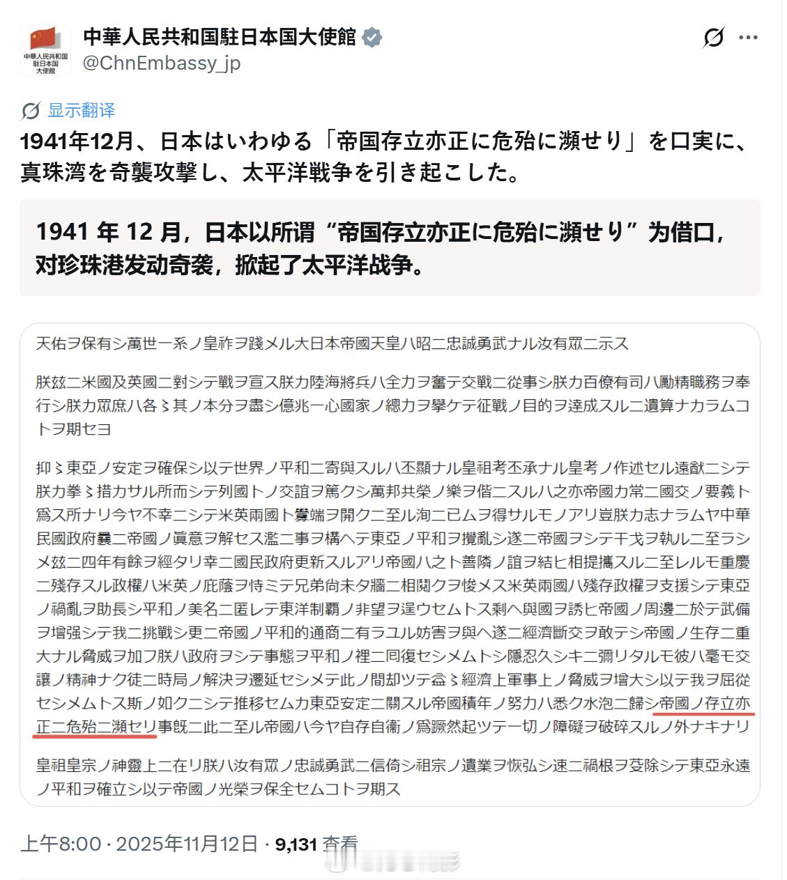 中国驻日本大使馆今天继续戳日本肺管子。其X官方帐号刚才发帖,指出1941年12月,日本正是以所谓“帝国的存续正濒临危殆”为借口,偷袭了珍珠港,引发了太平洋战争。而这种说法与高市早苗7日时的表态,即——以“国家存亡危机”为借口武力介入台湾问题的说法完全一致。而昨天,大使馆回顾“九一八事变”,指出历史上的日本也屡次以"国家存亡危机"为借口发动对外侵略,这还在日本引发热议。