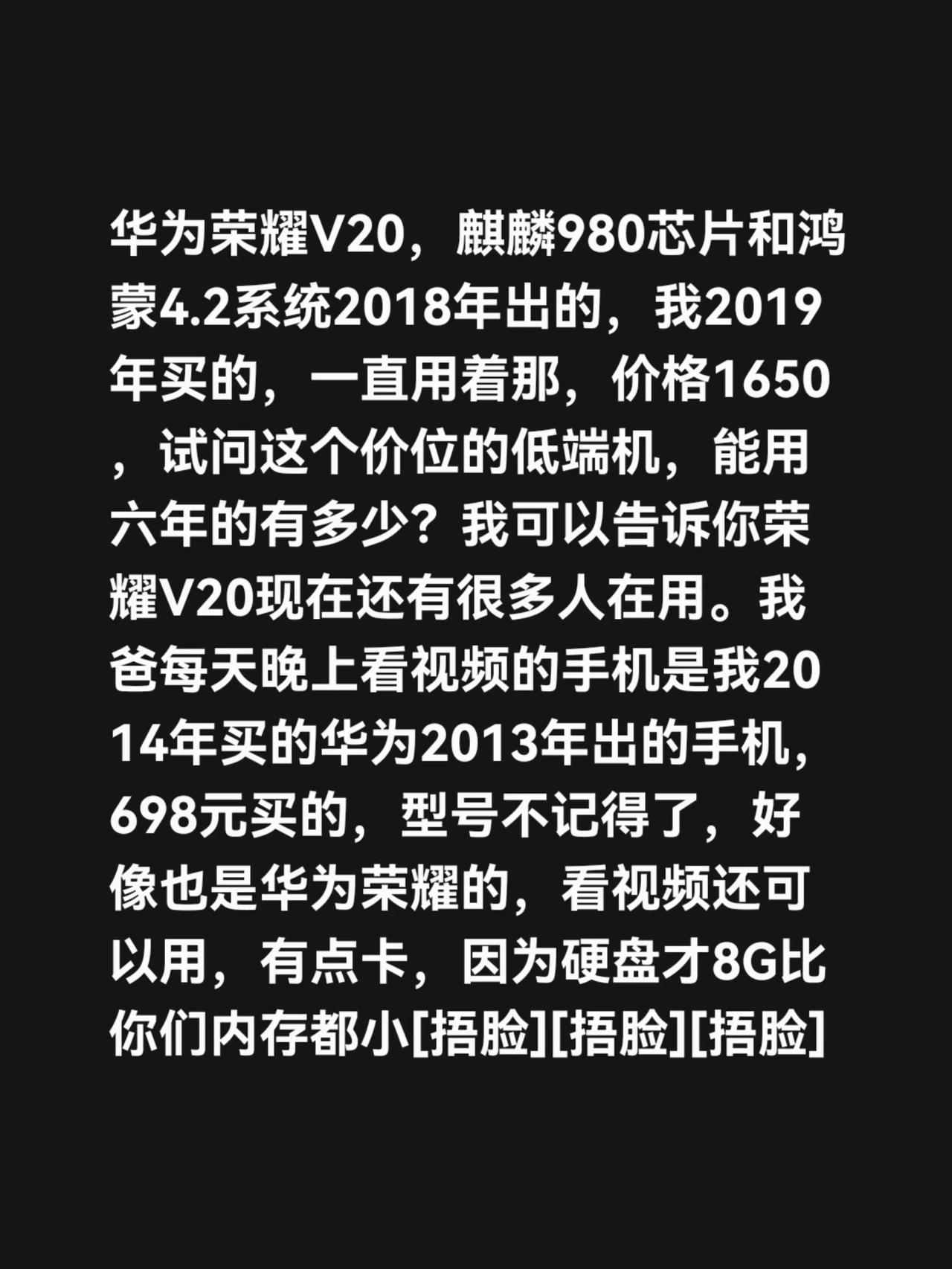 我评论了@小义有话说 的作品: 华为荣耀V20,麒麟980芯片和鸿蒙4.2系统2018年出的,我2019年买的,一直用着那,价格1650,试问这个价位的低端机,能用六年的有多少?我可以告诉你荣耀V20现在还有很多人在用。我爸每天晚上看视频的手机是我2014年买的华为2013年出的手机,698元买的,型号不记得了,好像也是华为荣耀的,看视频还可以用,有点卡,因为硬盘才8G比你们内存都小[捂脸][捂脸][捂脸]华为手机