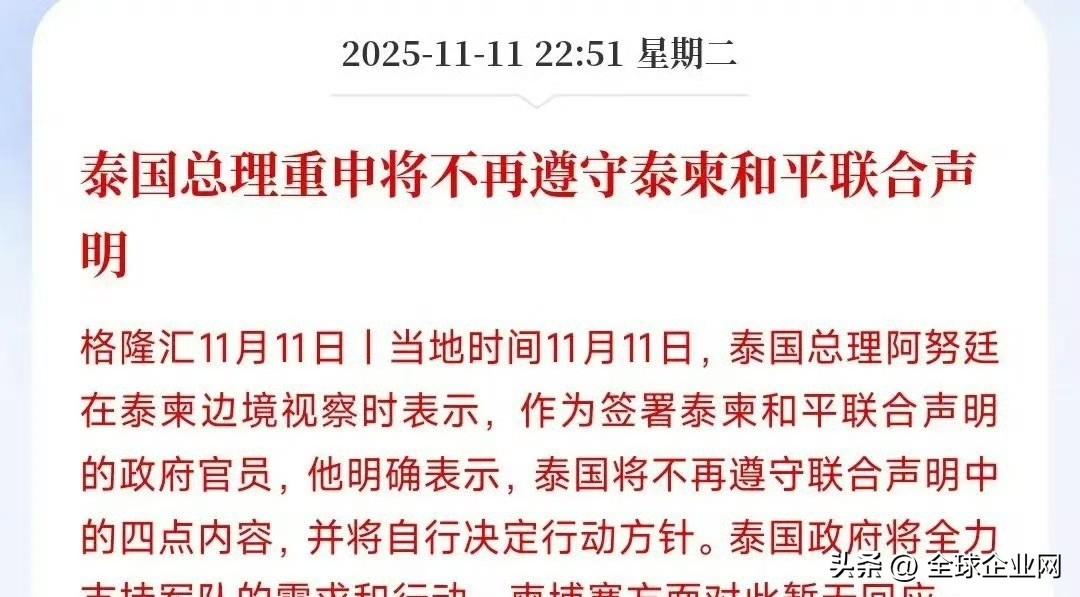 单方面撕毁合约,这次又是打了特朗普的脸 泰柬双方的冲突由于特朗普的调停已经过去了一段时间,但就在昨天泰单方面表示不会遵守10月26日双方签署的声明 1.边境争议地区撤除重型武器 2.联合清除地雷 3.打击跨境诈骗集团 4.建立边境共同管理机制 也就是说调停仅仅维持了两个星期,基本上就结束了,理由也很充分,就是再次有泰士兵在泰柬边境受伤。 泰撕毁了声明,就意味着很大可能泰柬将会进行新一轮的冲突,也就表面特朗普的调停再一次失败,上次失败是在俄乌冲突上面,很大的程度损害了世界第一的威严。