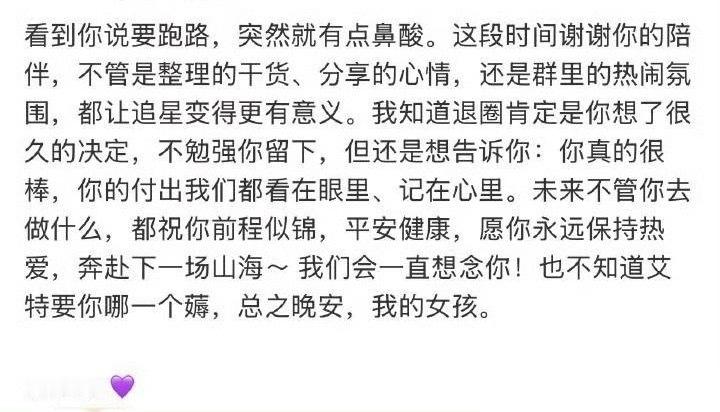 看到你说要跑路,突然就有点鼻酸。这段时间谢谢你的陪伴,不管是整理的干货、分享的心情,还是群里的热闹氛围,都让追星变得更有意义。我知道退圈肯定是你想了很久的决定,不勉强你留下,但还是想告诉你:你真的很棒,你的付出我们都看在眼里、记在心里。未来不管你去做什么,都祝你前程似锦,平安健康,愿你永远保持热爱,奔赴下一场山海~我们会一直想念你!也不知道艾特要你哪一个薅,总之晚安,我的女孩。