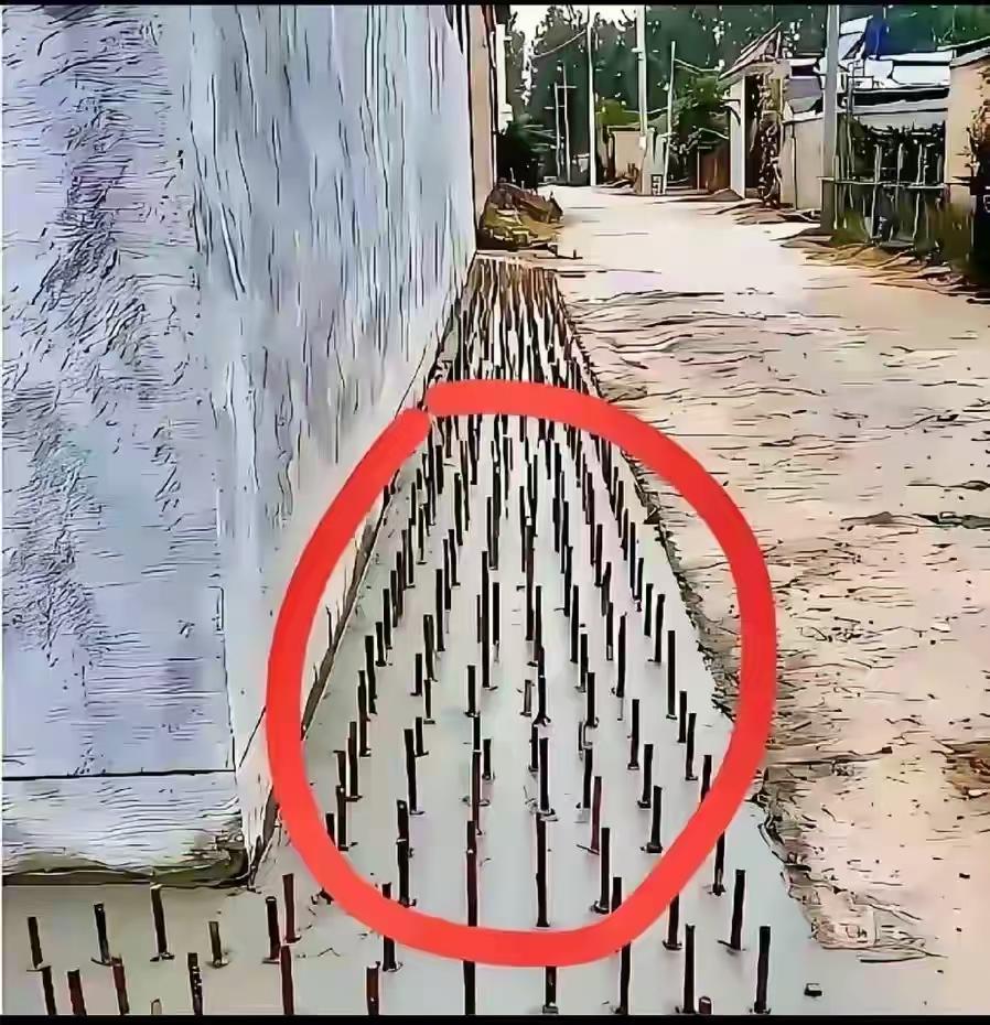 这家人为了护墙,竟然围着房子全部浇灌水泥差上尖锐都钢筋。这样做也太危险了,他家自己不走吗?,走了摔一跟头找谁,车不小心开偏了咋办 如果有人摔倒在纲筋上造成严重伤残,这家肯定倒大霉了,是要负全责的。