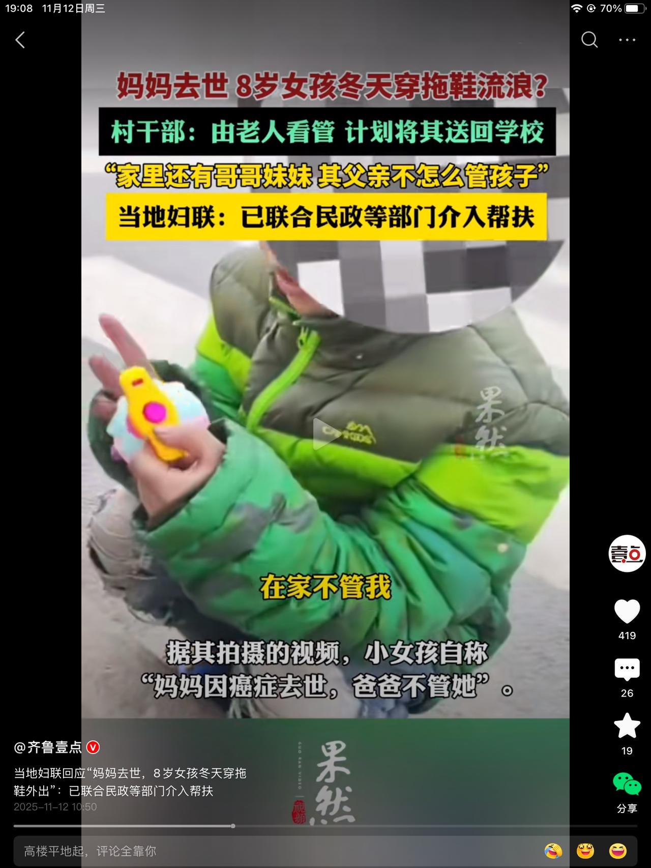 妈妈死了,爸爸不管我,孩子大冬天的穿着凉鞋拖儿出来了。没妈的孩子像个草啊!是真的啊!妈妈只有一个,没了。爸爸也有一个,不管孩子。跟没有区别不大。家里还有哥哥妹妹。村干部说,由老人抚养。准备送回学校。你说这样的能不能补助一下? 那些开豪车的,吹空调的,屁股都坐疼了吧?出门看看吧!特殊家庭的孩子太苦了啊!