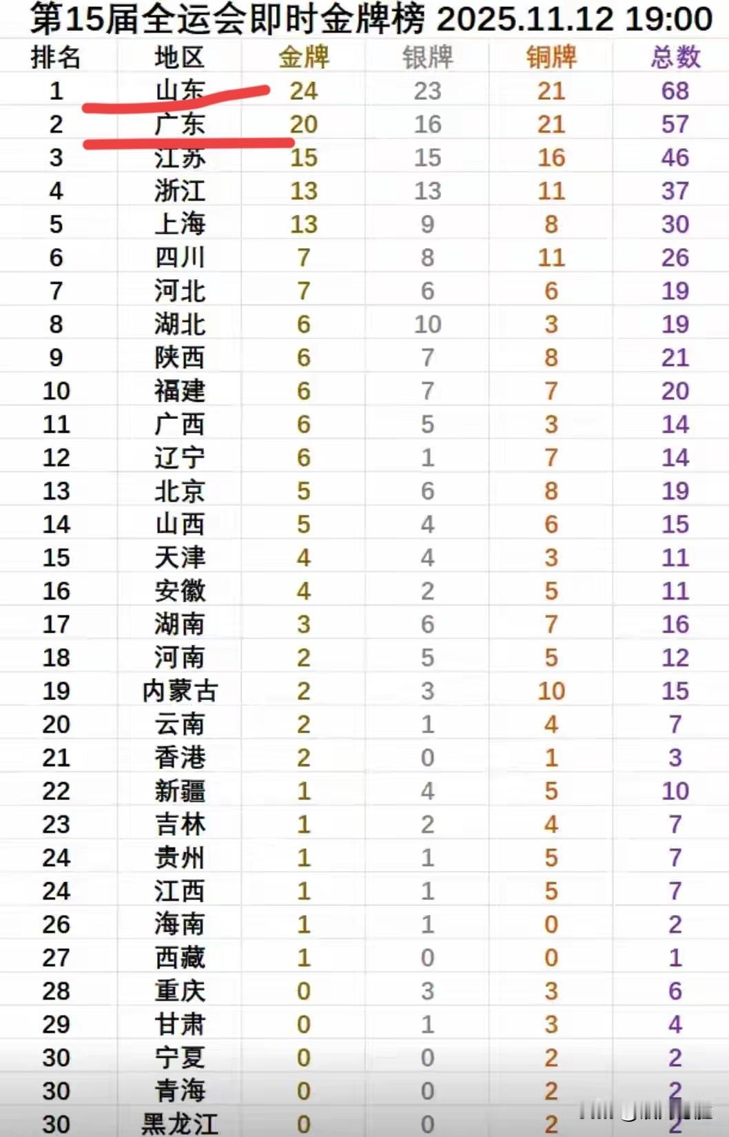 全运会山东金牌榜已经4连冠,今年第15届全运会在大湾区广东、香港和澳门举办,山东要想金牌5连冠是有些难度的,到昨天为止山东的金牌数24枚仍然排在第一,排在第二的广东队20枚是有可能凭借东道主超过山东队的。 山东省在2009年举办的第11届全运会开幕式是全运会历史上的天花板,今年全运会开幕式主题歌《天海一心》因为歌手周深的演唱被吐槽,没有阳刚之气,而山东全运会开幕式主题歌《相亲相爱》由孙楠、陈慧琳(香港)、古卓文(澳门)和张惠妹(台湾)共同演唱,今天听起来仍然是那么激昂动听,不信你就搜一下听听! 期待山东队全运会金牌5连冠!