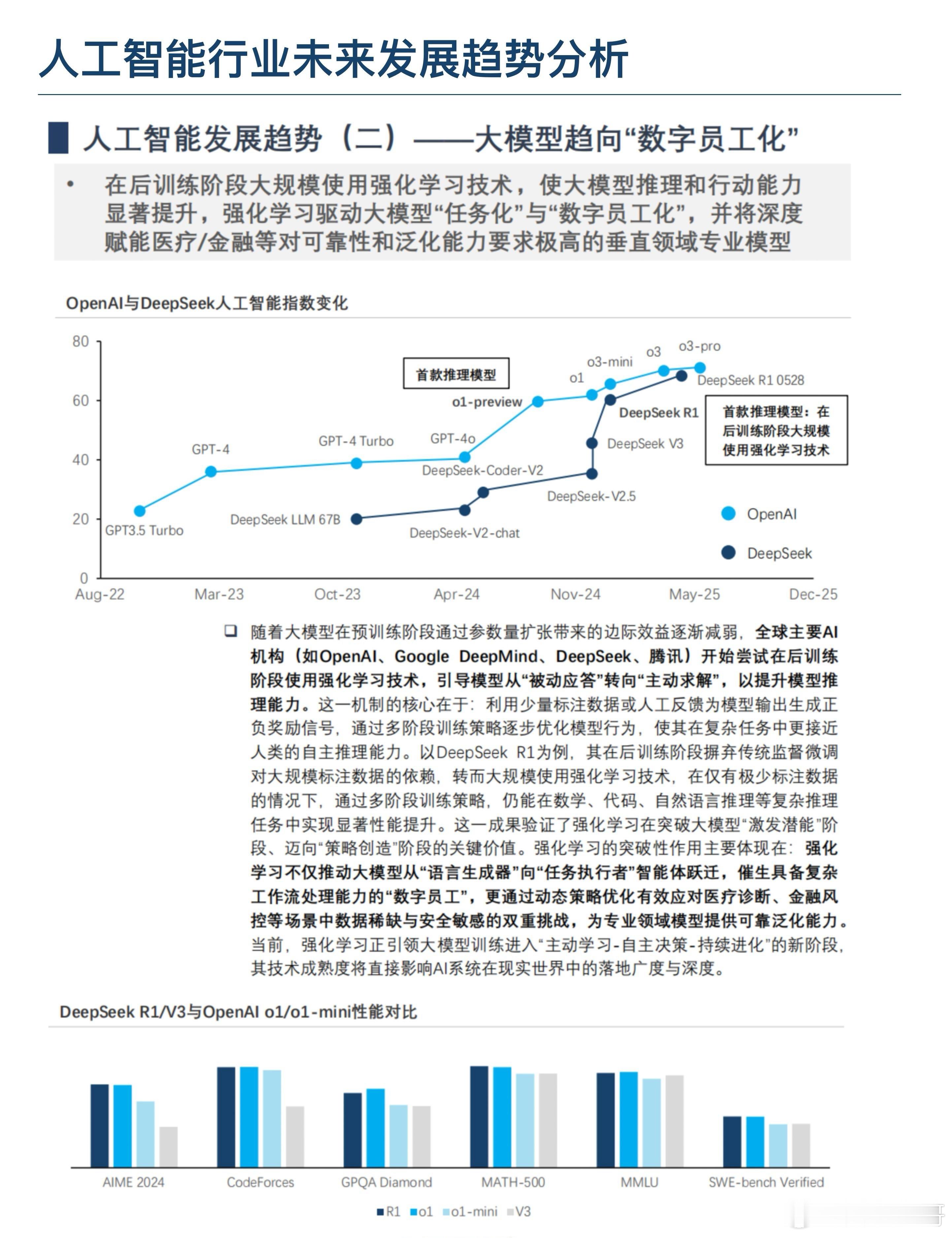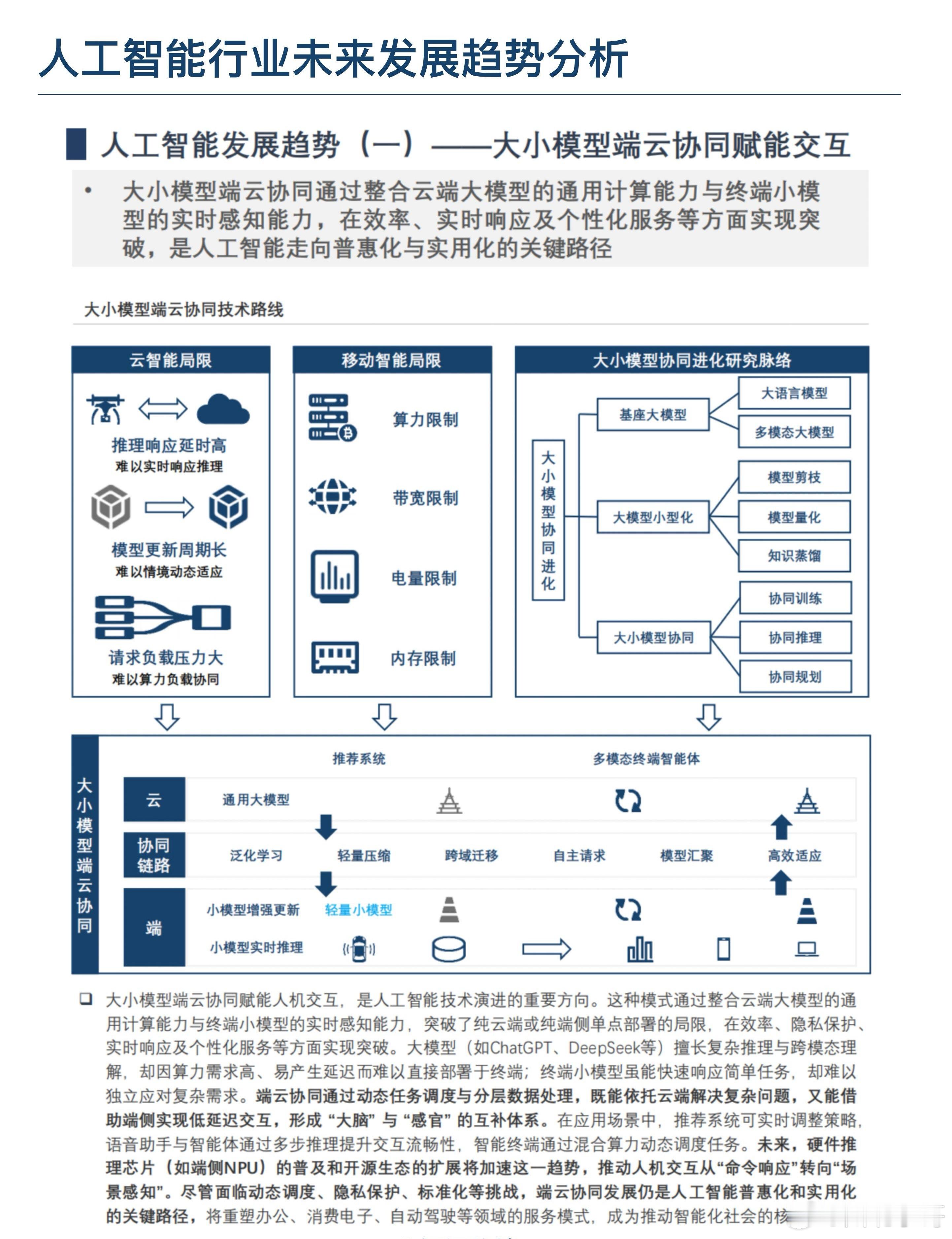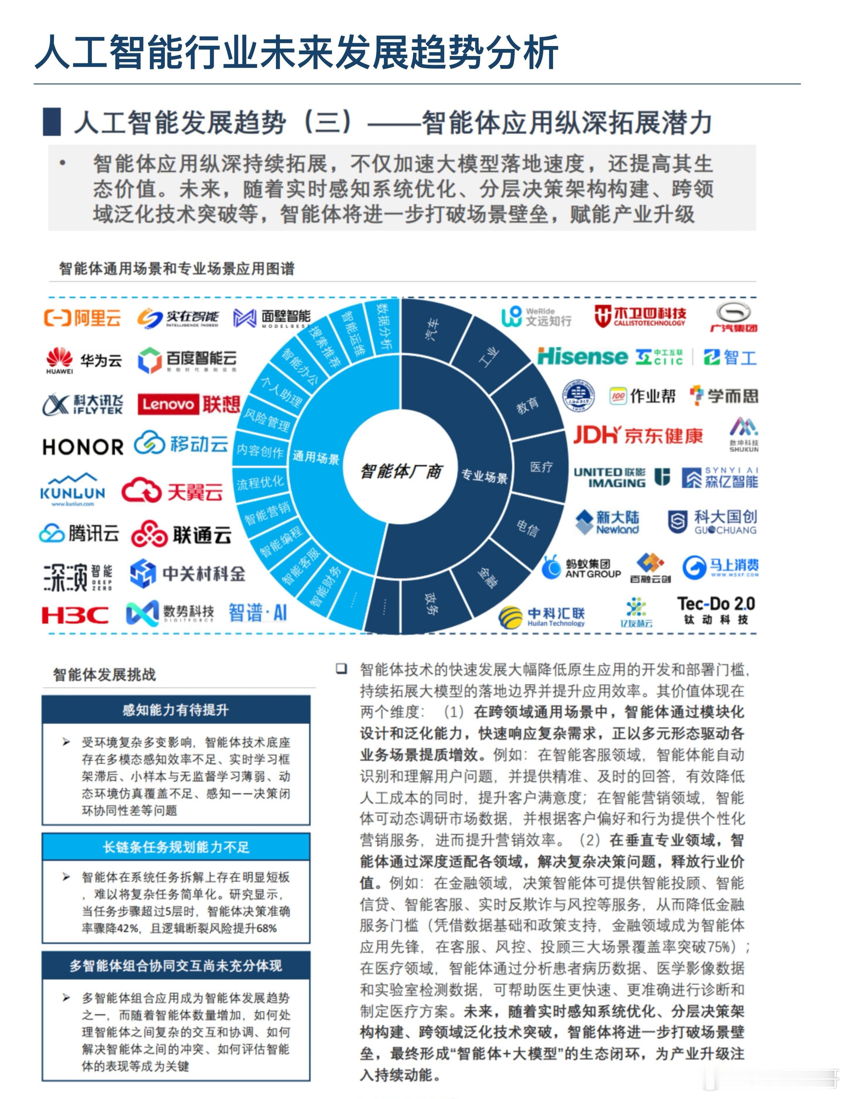 AI未来发展趋势洞察:1️⃣趋势一:大小模型端云协同赋能交互大小模型端云协同通过整合云端大模型的通用计算能力与终端小模型的实时感知能力,在效率、实时响应及个性化服务等方面实现突破,是人工智能走向普惠化与实用化的关键路径2️⃣趋势二:大模型趋向“数字员工化”在后训练阶段大规模使用强化学习技术,使大模型推理和行动能力显著提升,强化学习驱动大模型“任务化”与“数字员工化”,并将深度赋能医疗/金融等对可靠性和泛化能力要求极高的垂直领域专业模型3️⃣趋势三:智能体应用纵深拓展潜力智能体应用纵深持续拓展,不仅加速大模型落地速度,还提高其生态价值。未来,随着实时感知系统优化、分层决策架构构建、跨领域泛化技术突破等,智能体将进一步打破场景壁垒,赋能产业升级4️⃣趋势四:从“感知智能”到“具身智能”作为通向AGI的关键路径,具身智能行业呈现“巨头夯实场景、中小厂商突破技术”的协同生态。未来,行业将朝着虚实集成世界、要素一体化、智能体化、感知多模态化持续发展,能直接降低交互门槛5️⃣趋势五:加快构建AI安全治理体系2024年,全球AI风险事件达220件,同比增长近50%,AI安全问题逐渐凸显。与此同时,全球AI治理体系正在加速构建,技术防御能力与制度约束机制的协同强化,为AI向全行业、日常化普及提供保障内容来源,沙利文,《人工智能赋能各行各业》,图:知识秘境 仅做分享