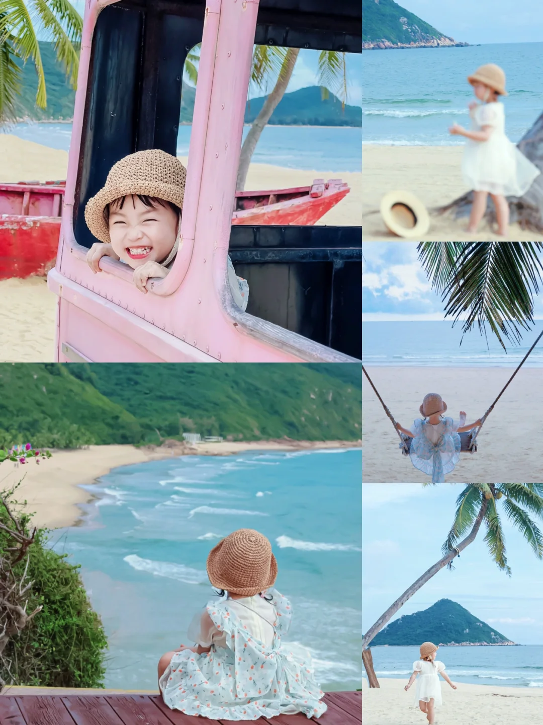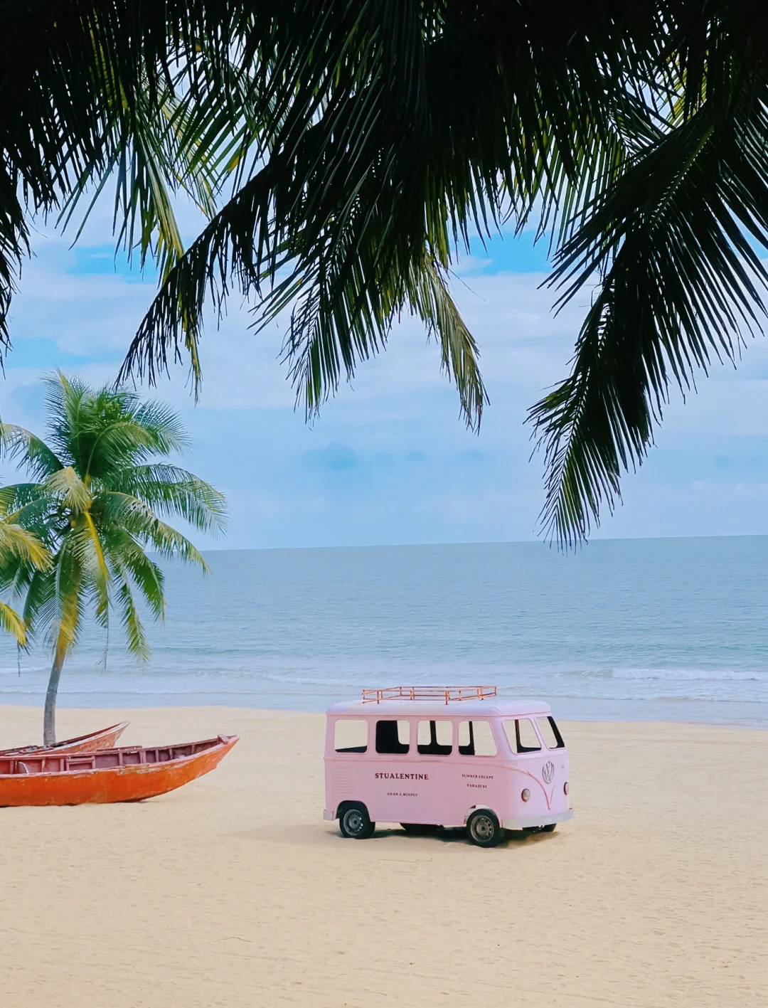 有非常多的拍照道具,满满的ins风,最让人心动的就是沙滩中间的一个粉色面包车,不管在里面还是外面拍都很出片,随手一拍就是一张明信片,另外还有白色小教堂,巴厘岛同款秋千,泡泡屋,椰林中的吊床,五颜六色的船,沙滩车等免费的道具,这里一步一景,每个地方拍照都超级好看~