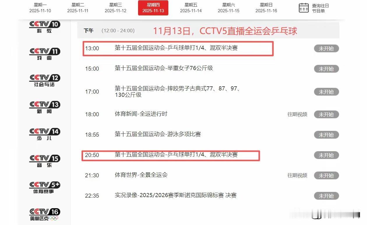 2. 全运会乒乓球直播调整 陈梦王楚钦迎来考验:11月13日全运会乒乓球女单1/4决赛,陈梦与国乒新星蒯曼强强对决,晋级4强悬念大;当日央视直播调整,CCTV5分下午13点、晚间20点50转播,CCTV5+不再直播。