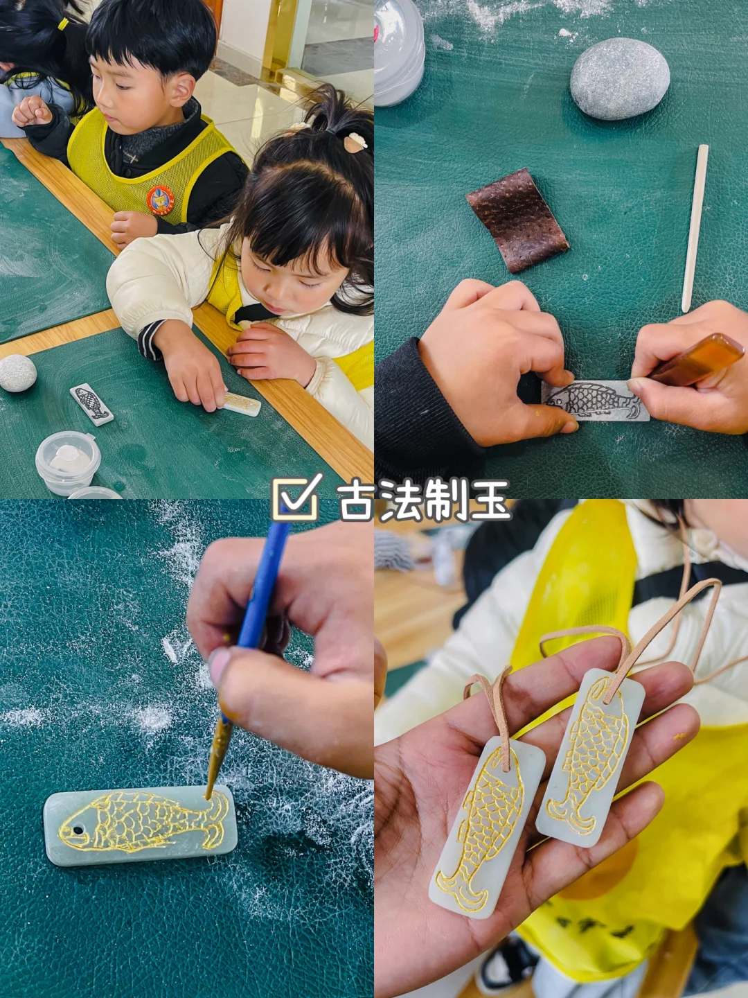 想要制作一块精美的属于自己的玉鱼,就要复原古人制玉的工具和工艺,经过雕刻,打磨,抛光和钻孔等四个步骤进行,最后给鱼上色系好绳子,一块亲手制作的玉器就完成啦,孩子们非常有成就感