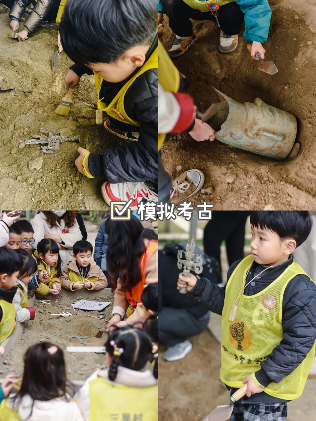 在老师的带领下,我们来到了孩子最期待,最喜欢的考古环节啦,孩子们拿着各种挖掘工具,亲自体验一次考古人的工作,在大家的共同协作下,一个大大的仿真青铜面具人出土了,寓教于乐,真的是一场很有趣的体验