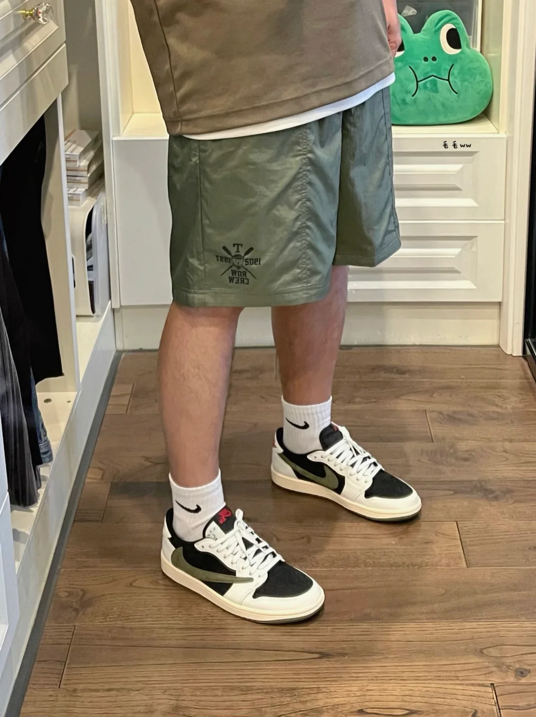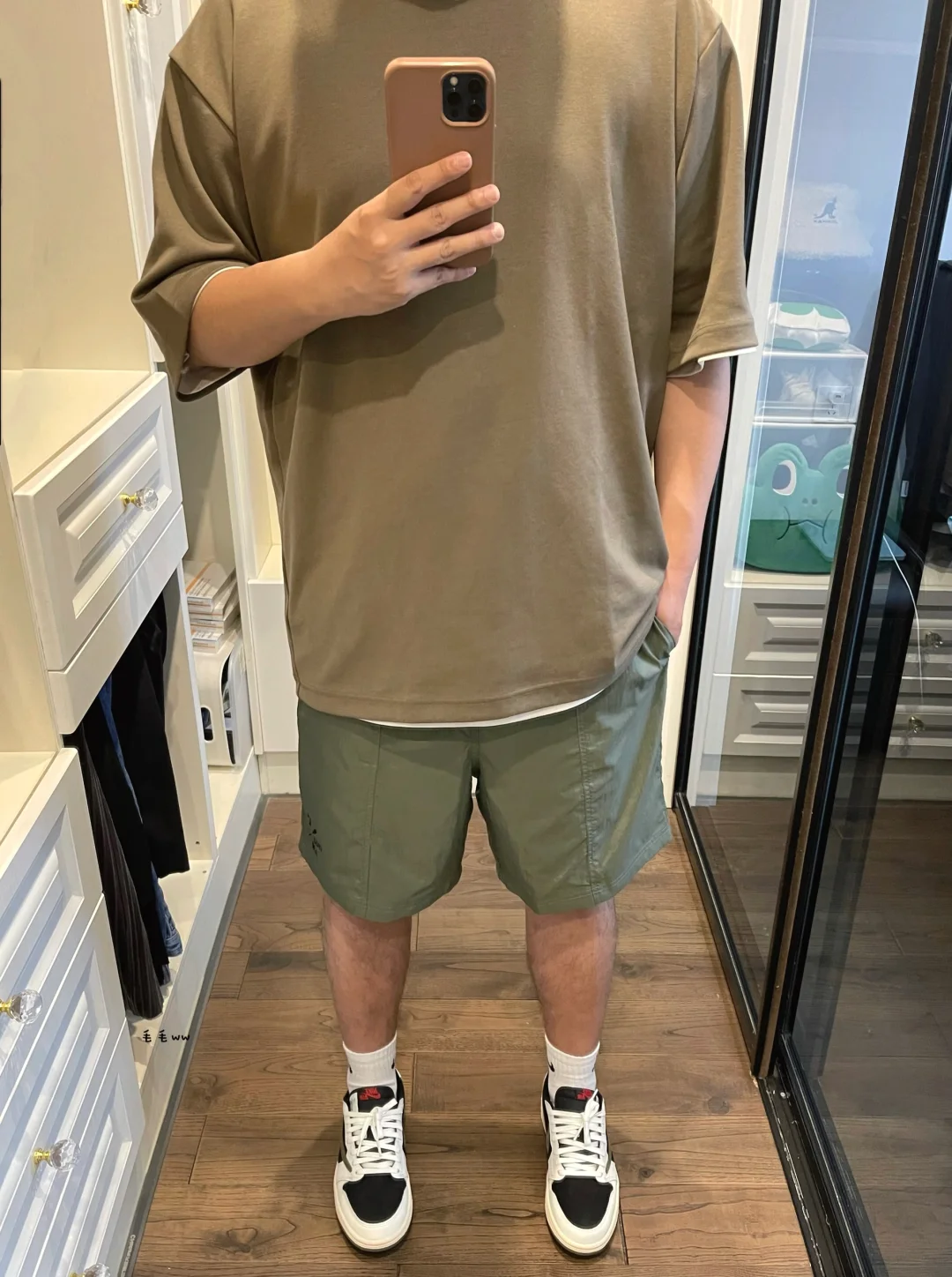 -U系列大师T,本季新出的两个绿色,翠绿色偏浅低饱和度,青绿色偏深实物泛棕 . -其实U家一直分不清棕色跟绿色,捉摸不透色卡;棕绿CP组合,索性就这么搭配 . —————— . ✏️本人178cm75kg 球鞋尺码265mm(正常EU42) . 💭以上均为我个人观点,不喜勿喷,欢迎讨论