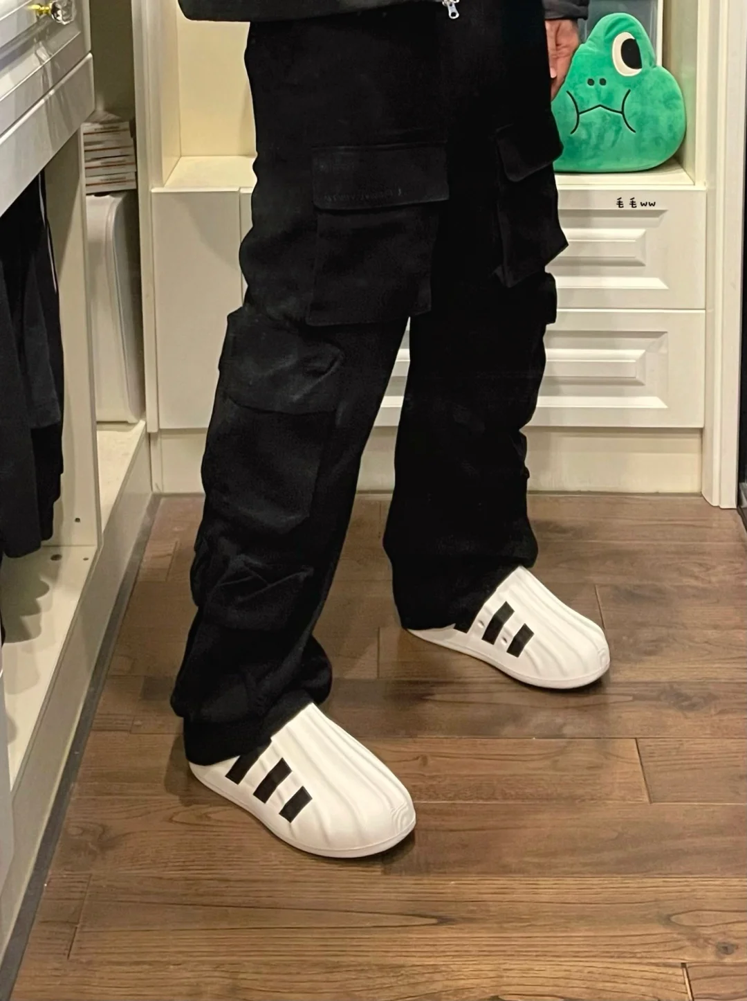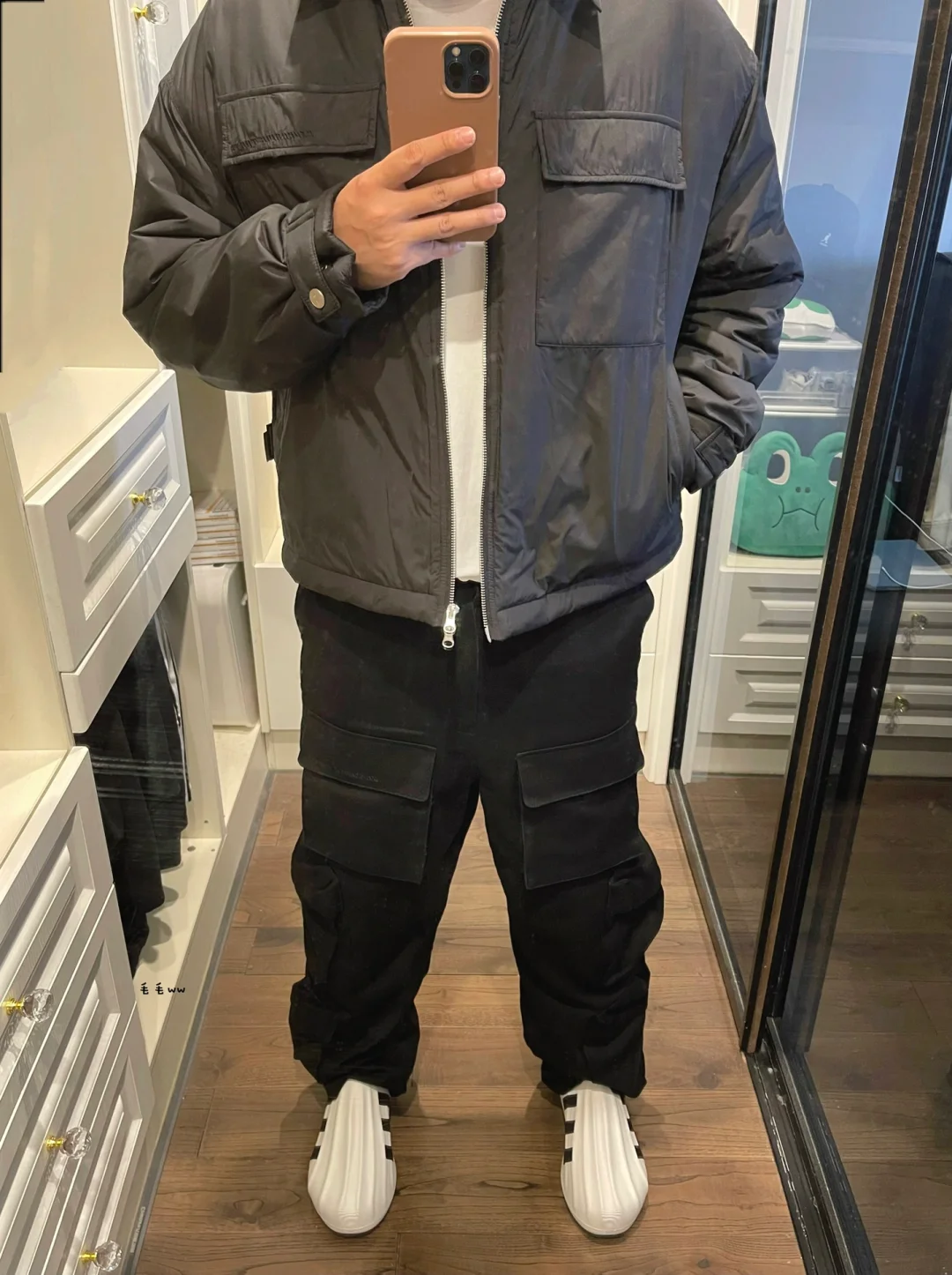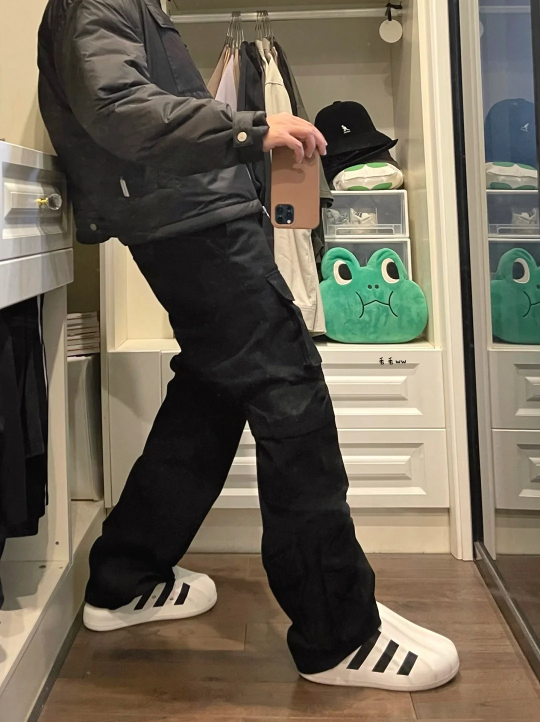 -Adifom,原本属于夏季的系列;没想到Superstar,居然穿到11月,一双四季的洞洞鞋 . -谁能拒绝显高显瘦的穿搭,短款棉服搭配阔腿裤,拉长腿型;全黑色系更是简洁又加分 . —————— . ✏️本人178cm75kg 球鞋尺码265mm(正常EU42) . 💭以上均为我个人观点,不喜勿喷,欢迎讨论。