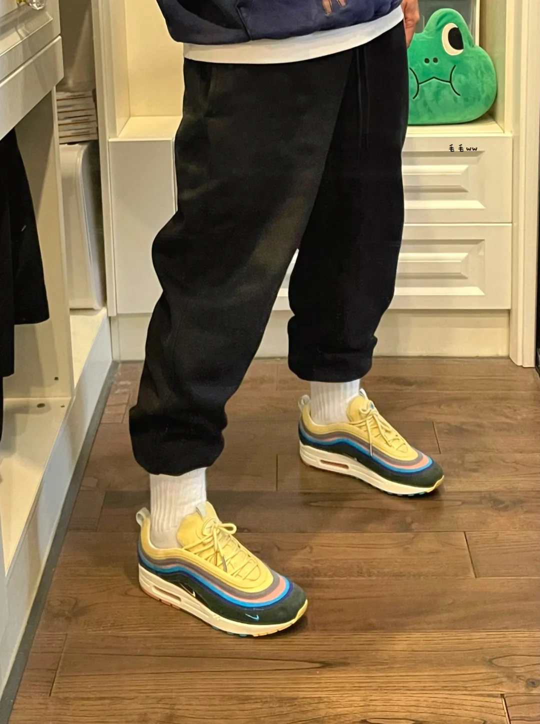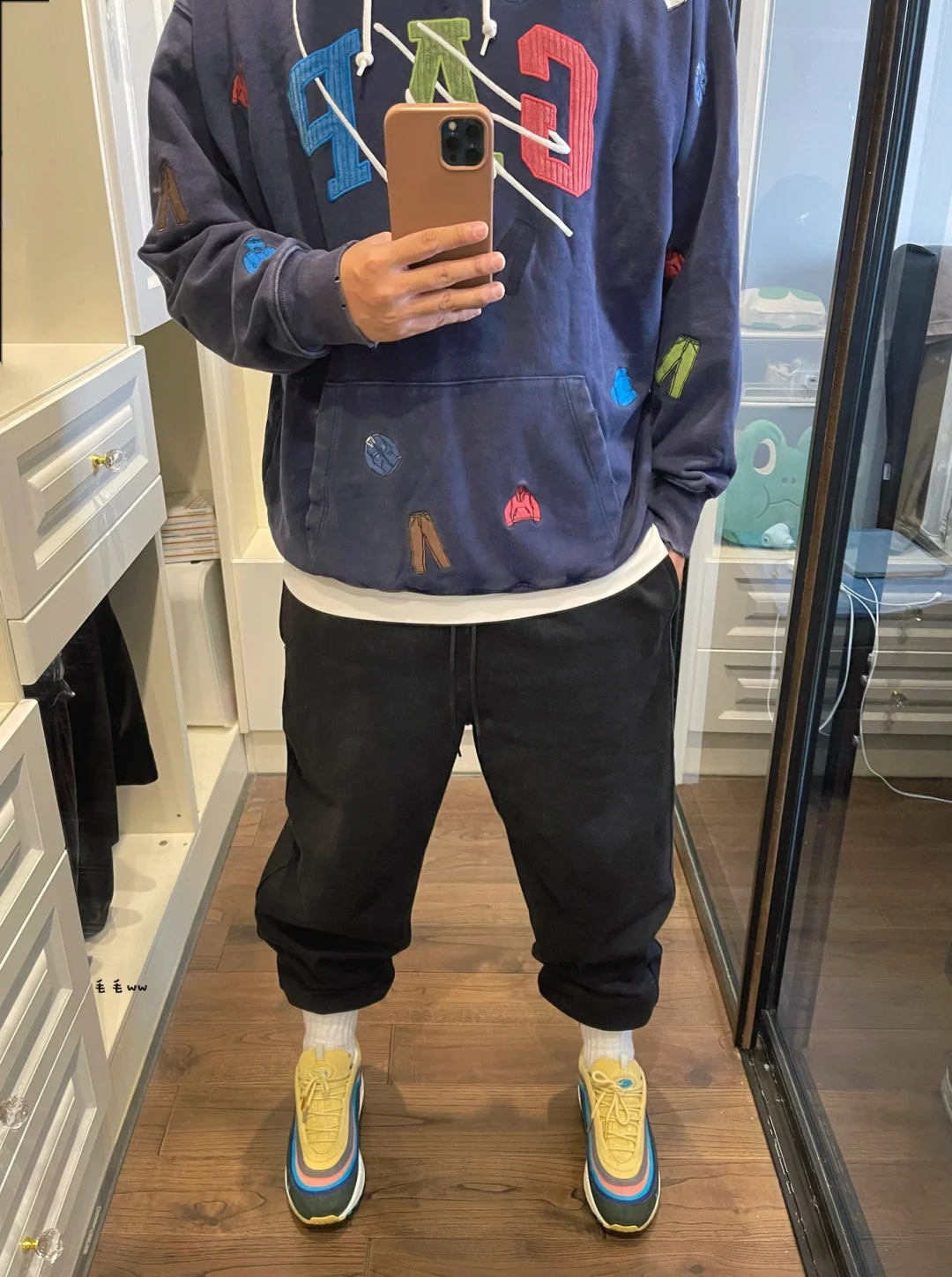 -SW工艺复杂的是帽衫,除了同裤装的刺绣满印,边缘破坏处理,三色灯芯绒logo是我喜欢的点 . -球鞋与上装做出呼应,束脚裤与细节(内搭长袜)尽量简洁,显得恰到好处,整身不需要太饱满 . —————— . ✏️本人178cm75kg 球鞋尺码265mm(正常EU42) . 💭以上均为我个人观点,不喜勿喷,欢迎讨论。