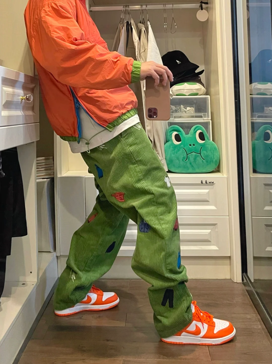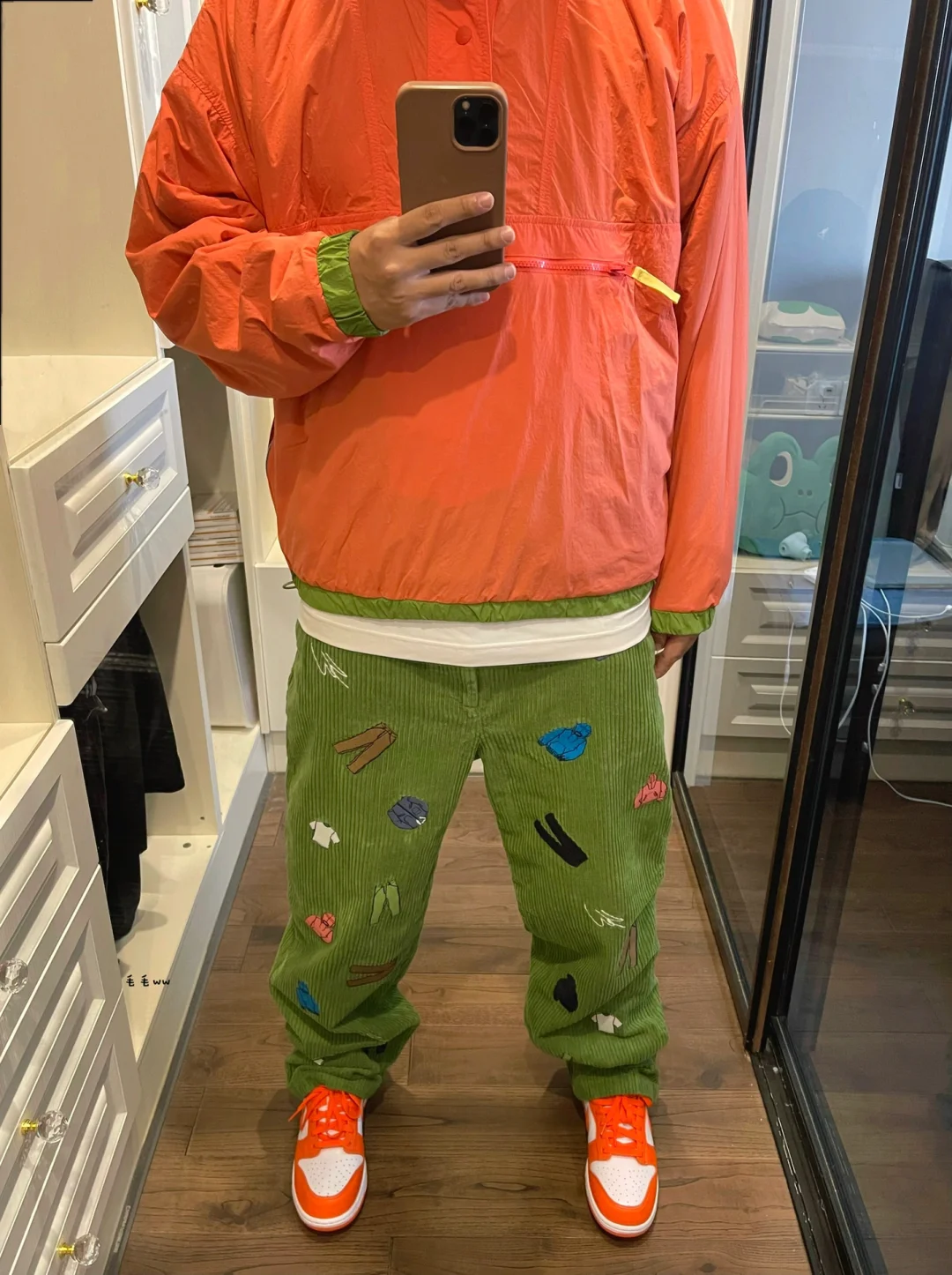 -SW特色在单品上体现的淋漓尽致;半拉链上装&灯芯绒下装,绿色橙色的组合显眼且无违和感 . -系列产品的剪影做成满印,裤装帽衫呈现;灯芯绒克数比不上牛仔,同样版型,但上身略逊一筹 . —————— . ✏️本人178cm75kg 球鞋尺码265mm(正常EU42) . 💭以上均为我个人观点,不喜勿喷,欢迎讨论。