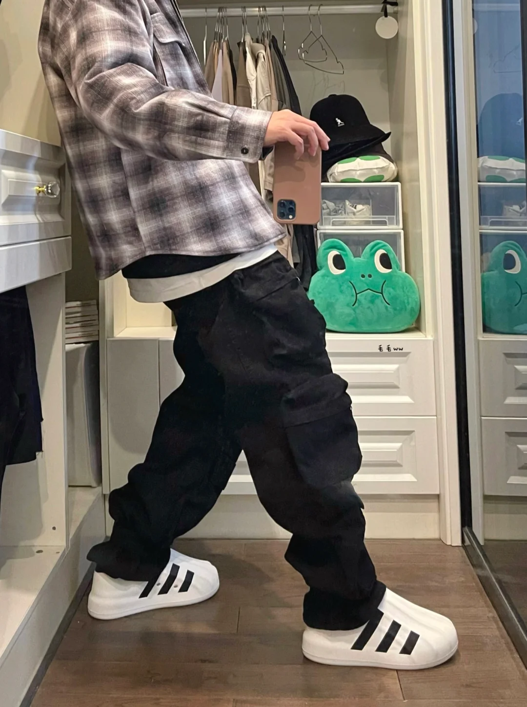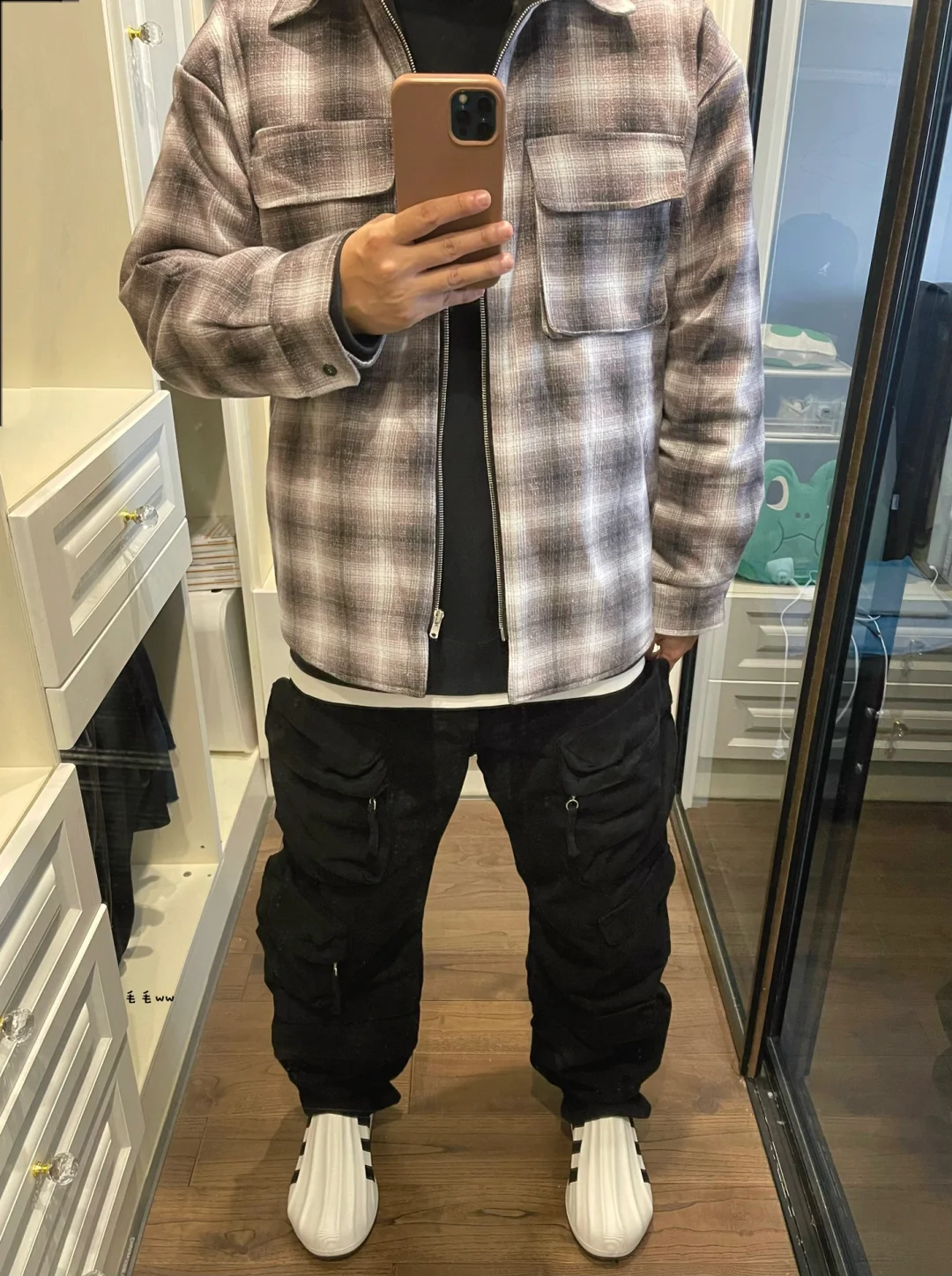 -棉服简易叠穿,卫衣内搭体恤打底;帽衫也可以跟尖领配合,短宽的版型容易做出层次 . -黑白格纹穿搭,黑裤白鞋搭配即可;窄裤配合瘦瘦尖头鞋,宽松工装裤选择胖胖面包鞋 . —————— . ✏️本人178cm75kg 球鞋尺码265mm(正常EU42) . 💭以上均为我个人观点,不喜勿喷,欢迎讨论。