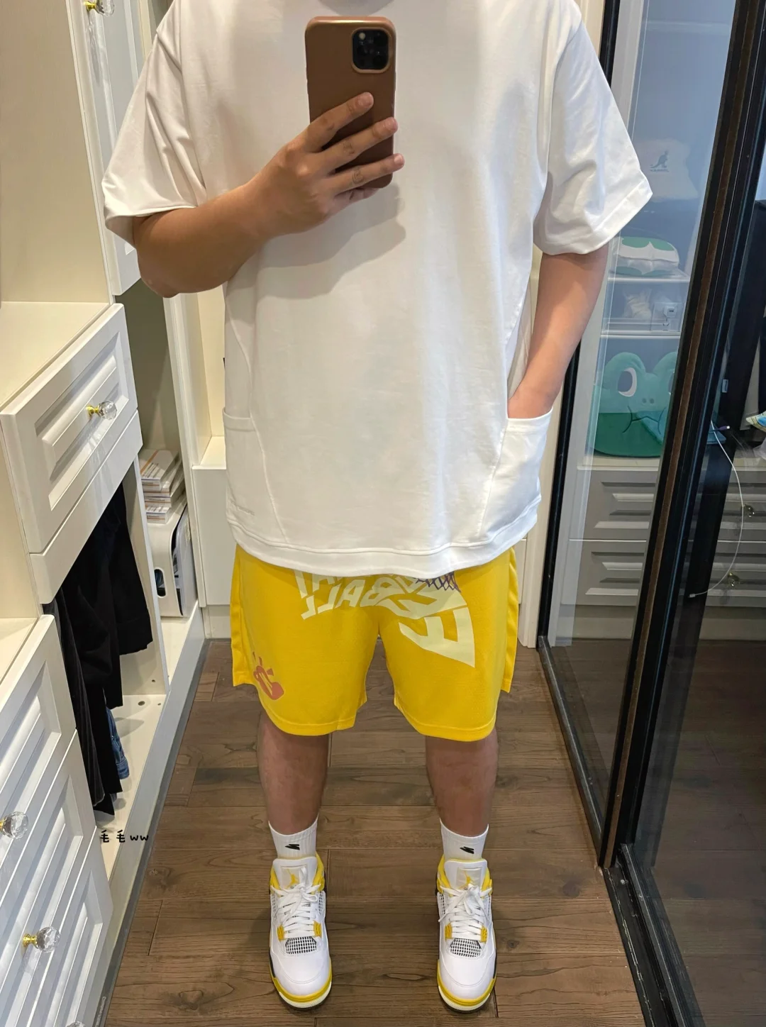 -春夏季穿搭,需要彩色系点缀,本期搭配亮黄色;如果把上装下装球鞋分为三个区块,那么分色为白色-黄色-白黄色(白色为主) . -尽量把大面积彩色集中在一个区块,凸显特点,剩下用干净的白色提升视觉效果;补充少量细节即可,比如球鞋球袜上的配色呼应 . —————— . ✏️本人178cm75kg 球鞋尺码265mm(正常EU42) . 💭以上均为我个人观点,不喜勿喷,欢迎讨论。