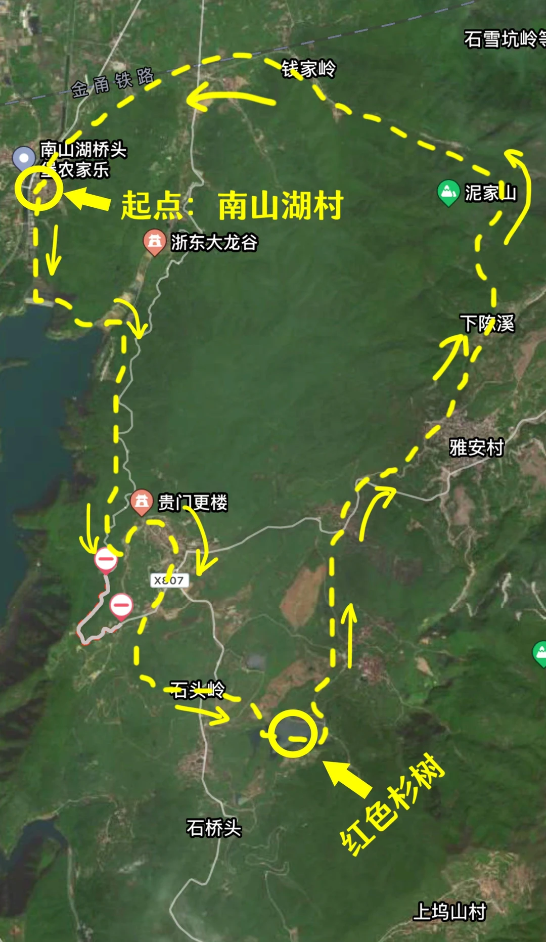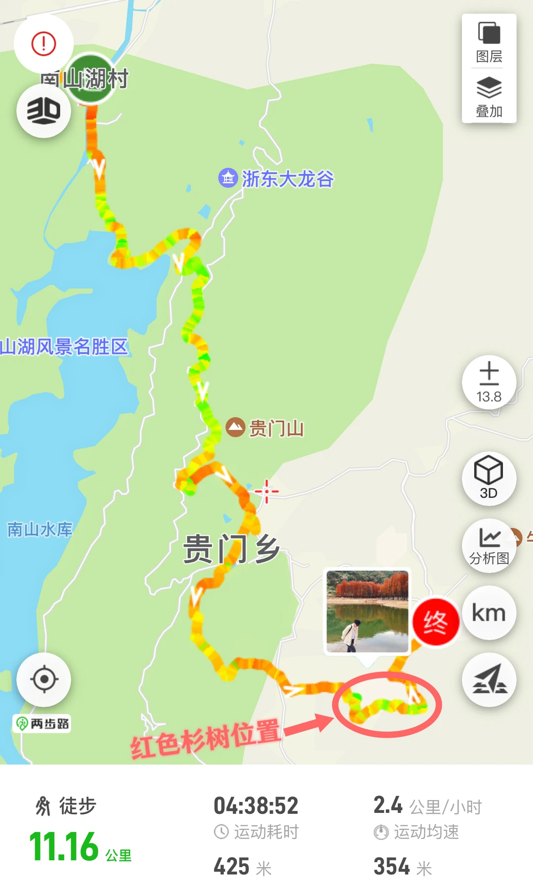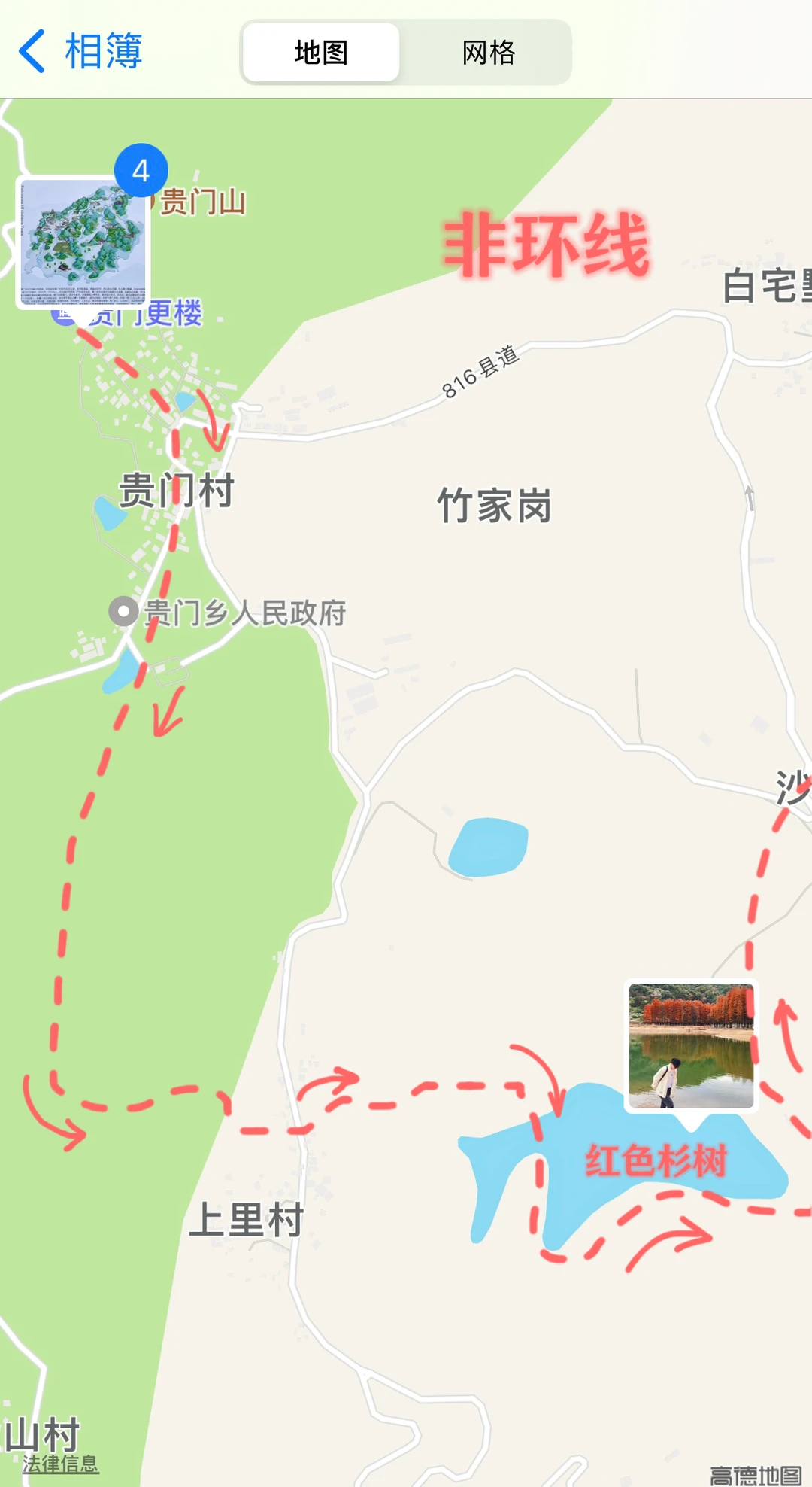 11月的绍兴·更楼真的好美!杉树由黄渐变至火红,倒映在碧波荡漾的湖水中,简直美如画卷!🤩 - 秋高气爽的时节,无论是带娃秋游还是约上朋友来此露营徒步,都好惬意🍂 - 徒步难度:⭐⭐⭐ 杉树呈红黄色——11月 杉树呈火红色——12月 📍起始地址:绍兴市嵊州市南山湖村 👉🏻If不徒步光露营赏秋,可以直接开到红杉林位置) - [一R]非环线(图3) 🔸全程约10公里,预计4.5小时走完全程 🔸终点和起点在两头,我跟的户外团,大巴会停在指定终点等待,或者提前包车在终点等候,自驾不适合该路线。 🔸如果从上海出发,一般11:00到徒步起点,下午三四点返程,全程慢悠悠,差不多晚上七八点就能回上海,杭州就更近了~ - [二R]环线(见图4) 🔸全程约19公里,预计7小时走完全程。 🔸如果从贵门更楼直接转向往雅安村走,则全程约14公里,预计5.5小时走完全程,可根据体力酌情选择路线。 🔸环线全程耗时较长,建议从早上八九点开始徒步 - ⚠️注意事项: 🍁南山湖村往前「三能中心」附近,有免费停车场 🍁路途中便利店、厕所点相隔较远,建议提前解决 🍁贵门村有家店的「年糕豆腐汤」非常好吃,有人可以连喝三碗,10元一碗可以无限续 - 📝携带物品:登山杖、墨镜、身份证、至少一瓶水、干粮、无人机(可选) --------------------