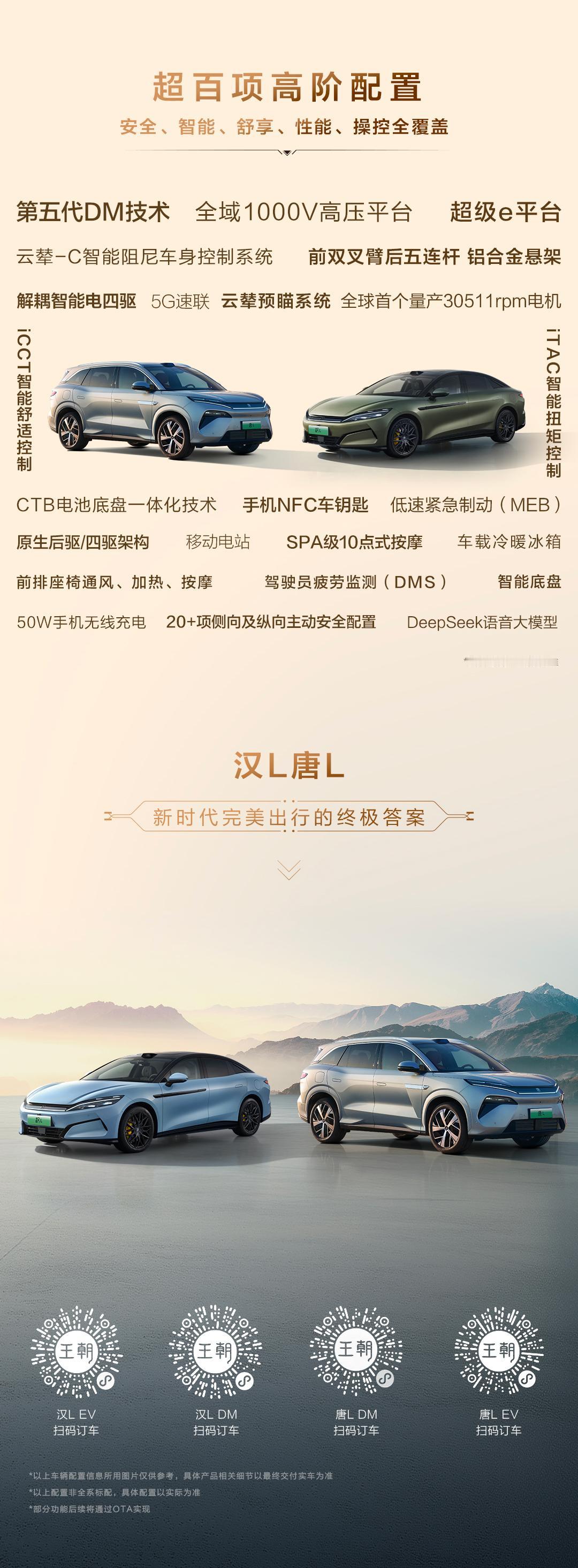 11月21日,比亚迪汉L唐L携新车色及OTA升级正式发布,绝对是科技满配颜值翻倍。汉L EV、唐L EV搭载超级e平台,拥有16项全球第一,峰值充电功率达1000kW,5分钟补能400公里,动力性能强劲,零百加速最快仅2.7秒,荣获“中国心”2025年度十佳新能源汽车动力系统大奖。汉L DM、唐L DM标配第五代DM技术,兼顾性能与效能,零百加速最快3.9s,亏电油耗最低3.9L/100km。设计上,二者推出橄榄绿全新车色,汉L还有西子蓝,融合东方美学与现代工艺。此外,汉L有黑化运动套件。智能化方面,全系标配智能座舱高阶版-DiLink 150,UI设计、动态主题等全面焕新,为用户出行增添乐趣。科技满配颜值翻倍