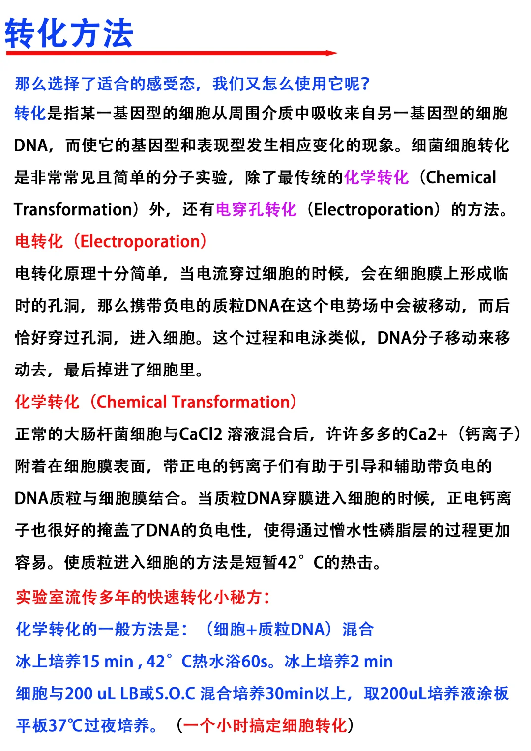 主要原理就是通过处理使细胞的通透性变大,直观的说,使得细胞膜表面出现一些孔洞,便于外源gene 或载体进入感受态细胞。由于细胞膜的流动性,这种孔洞会被细胞自身所修复。