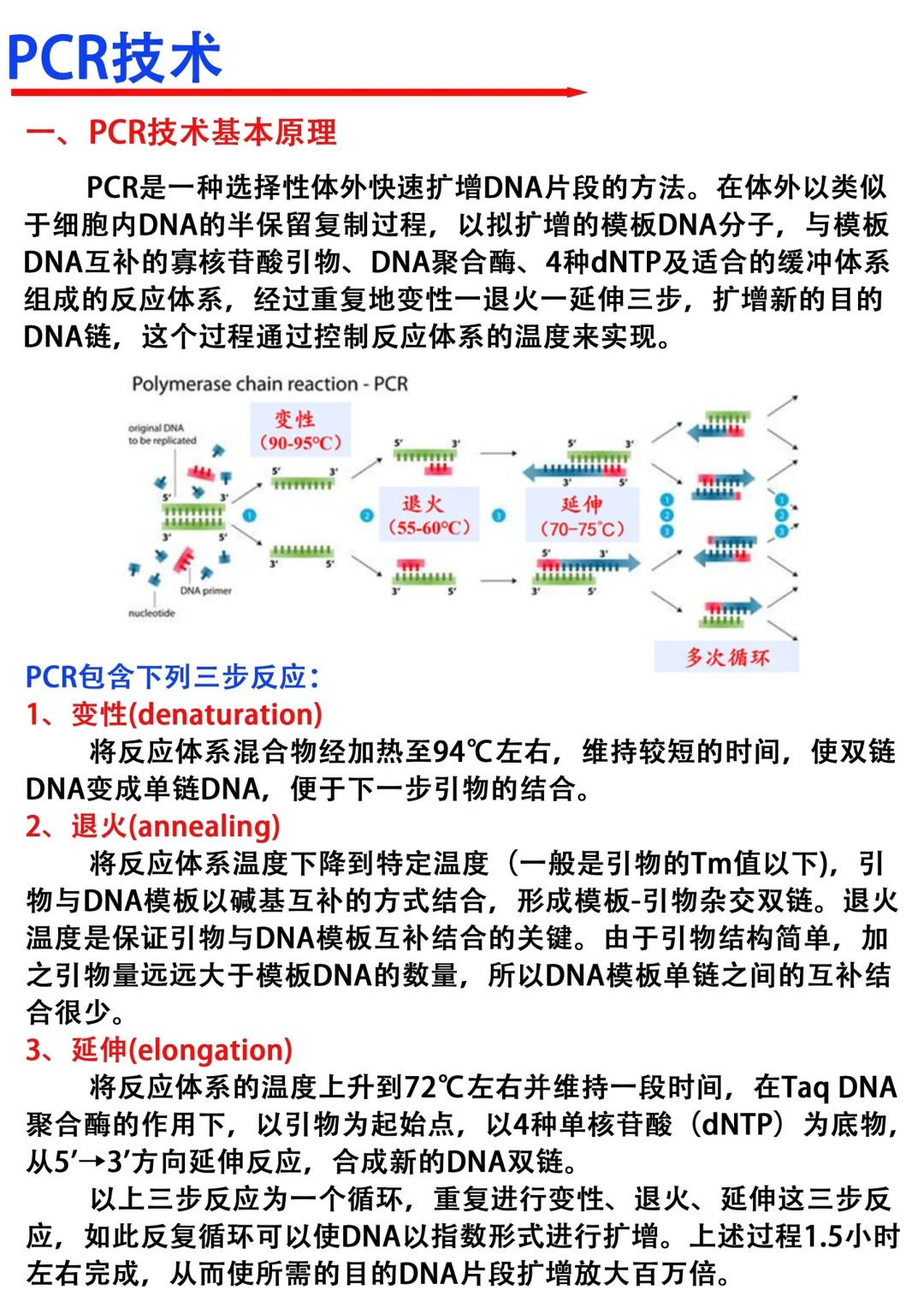 Hi~做了这么久的PCR,大家原理真的搞懂了嘛[暗中观察R] 今天给大家分享的是PCR扩增技术 [向右R]本期主要从以下四个方面进行分享 1⃣️PCR技术基本原理 2⃣️PCR各步骤目的 3⃣️PCR反应体系 4⃣️常用的的PCR扩增技术 [赞R]满满的干货与Tips,欢迎大家👍收藏,一起讨论交流呀