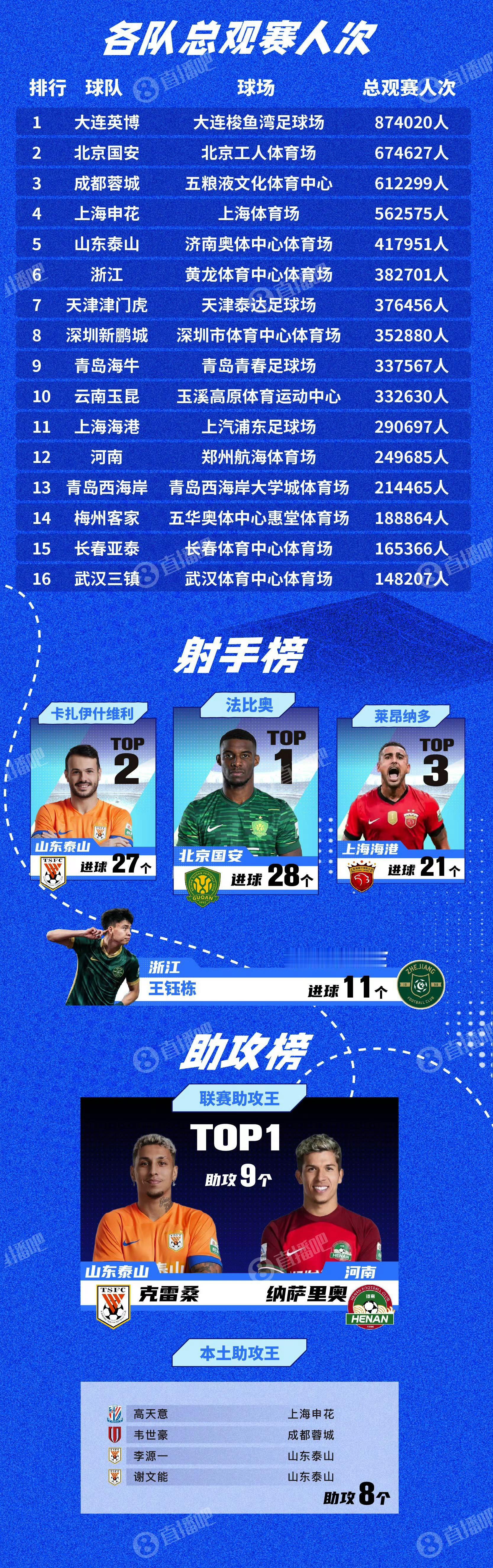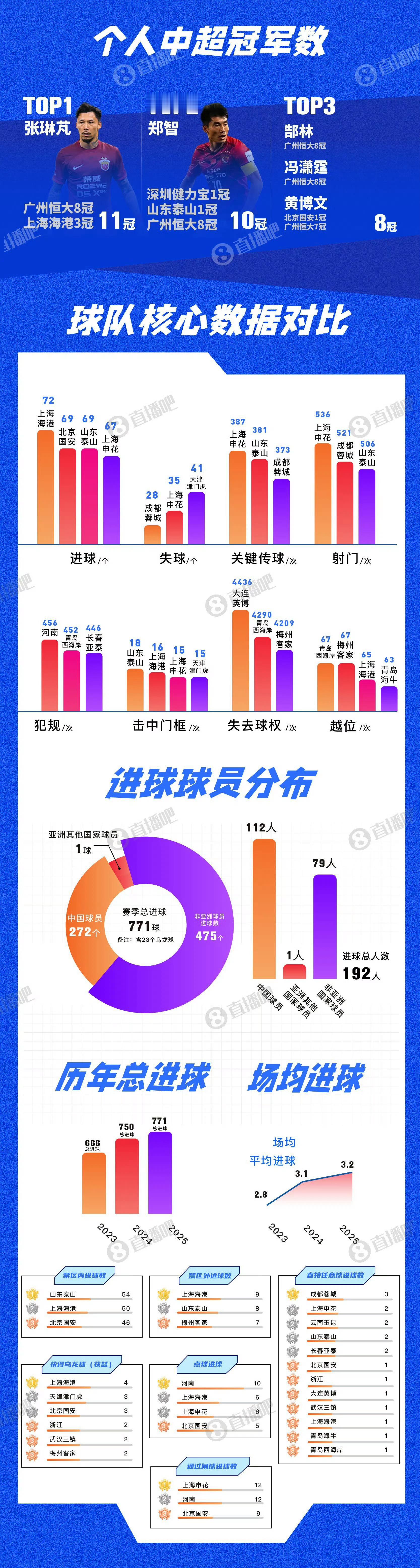 直播吧2025中超数据大盘点来袭!70项核心数据全输出,上座、跑动、抢分榜一键解锁~ 36岁张琳芃11冠创历史,总进球771粒场均3.21球,433最佳阵容+各队战力解析,速戳解锁完整数据!