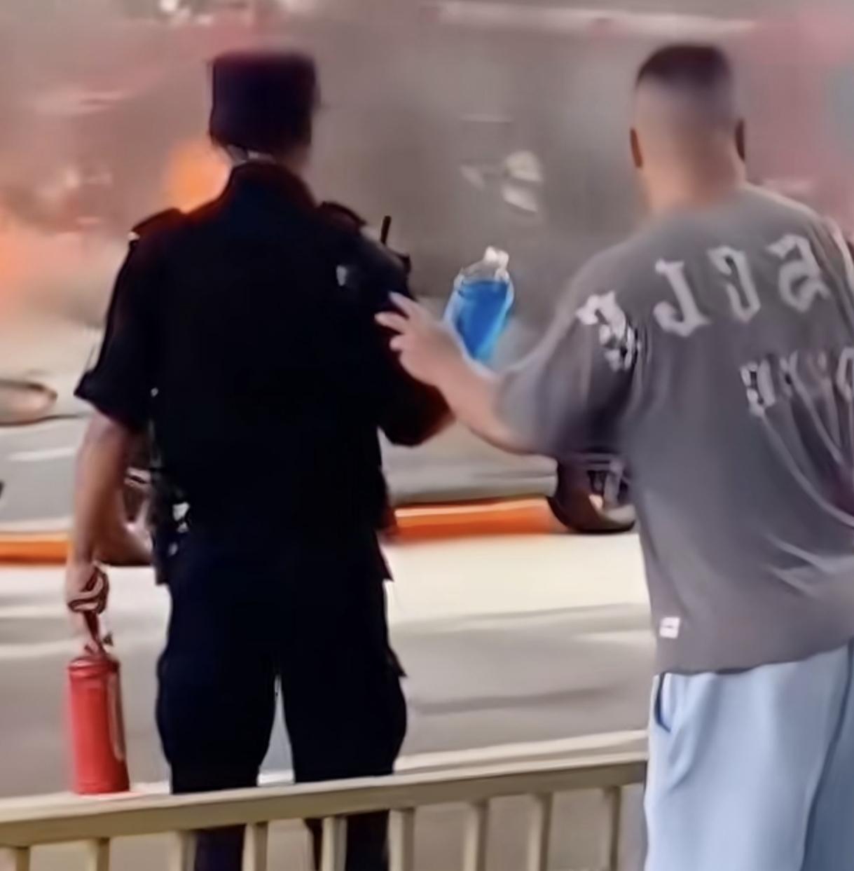 路边车辆自燃 男子递给民警一瓶玻璃水 见过有坑爹的,有坑兄弟姐妹的,男子是想坑警察呀 男子把玻璃水递给民警,警察:兄弟你感觉合适吗?关键是,男子一个劲的推民警拿玻璃水灭火