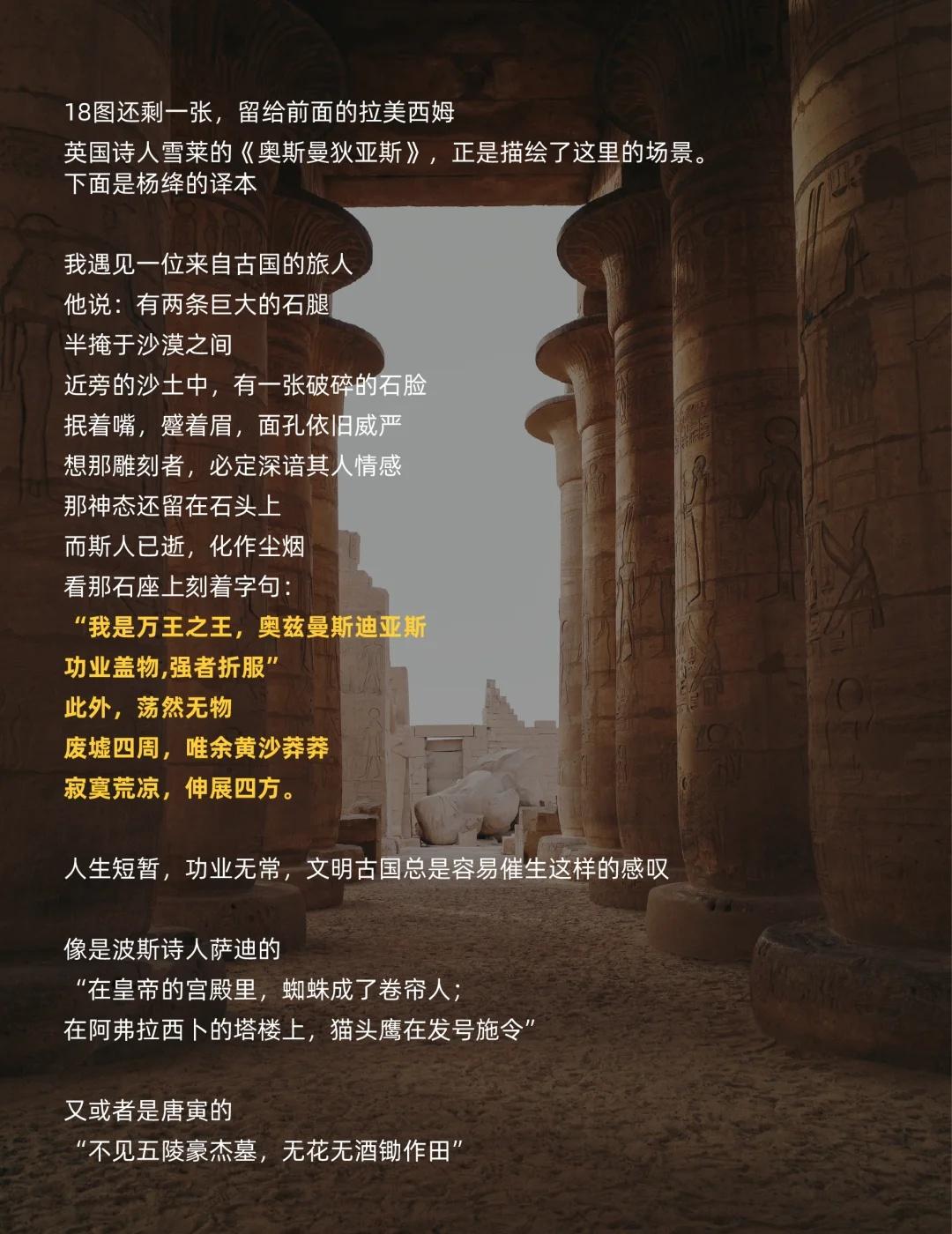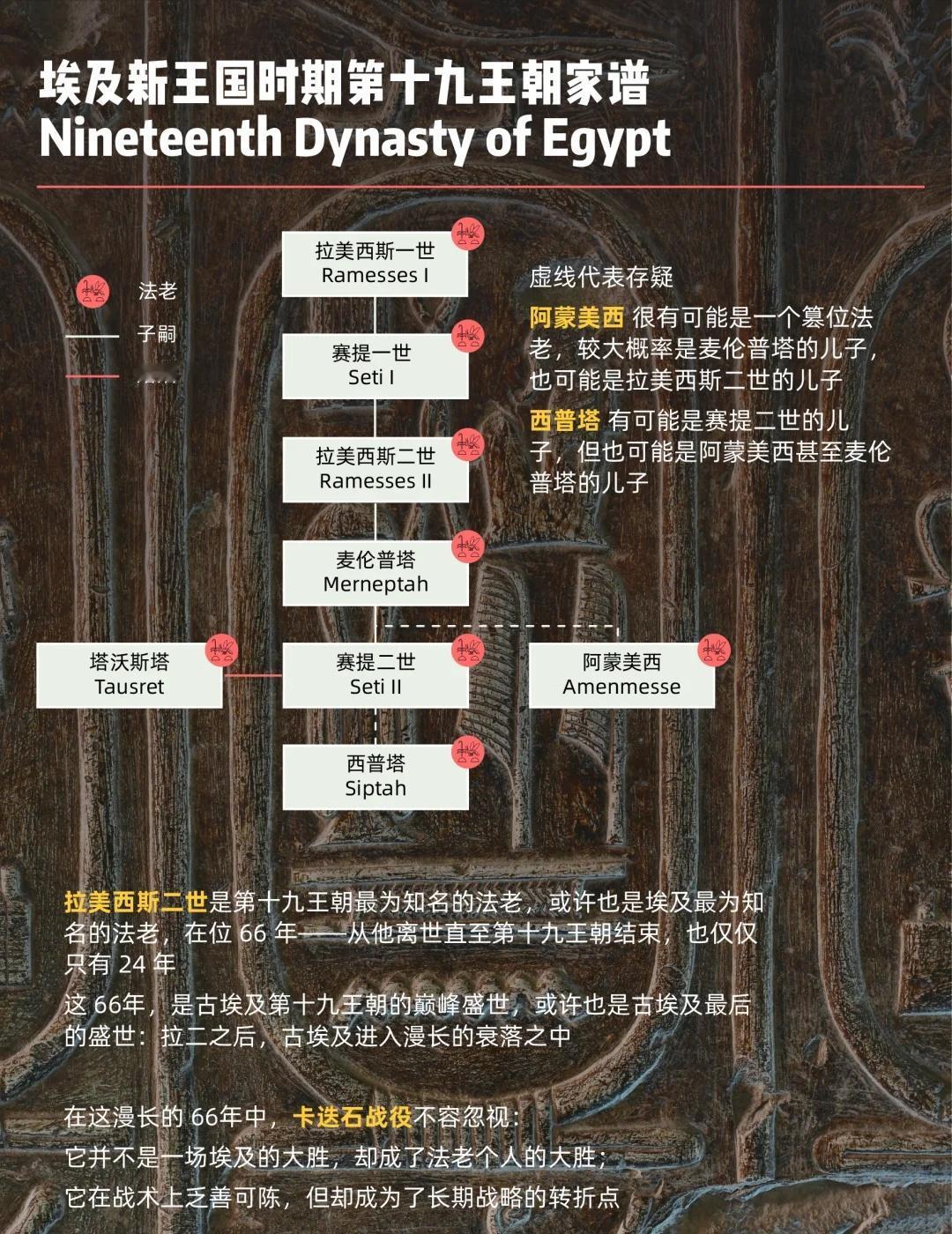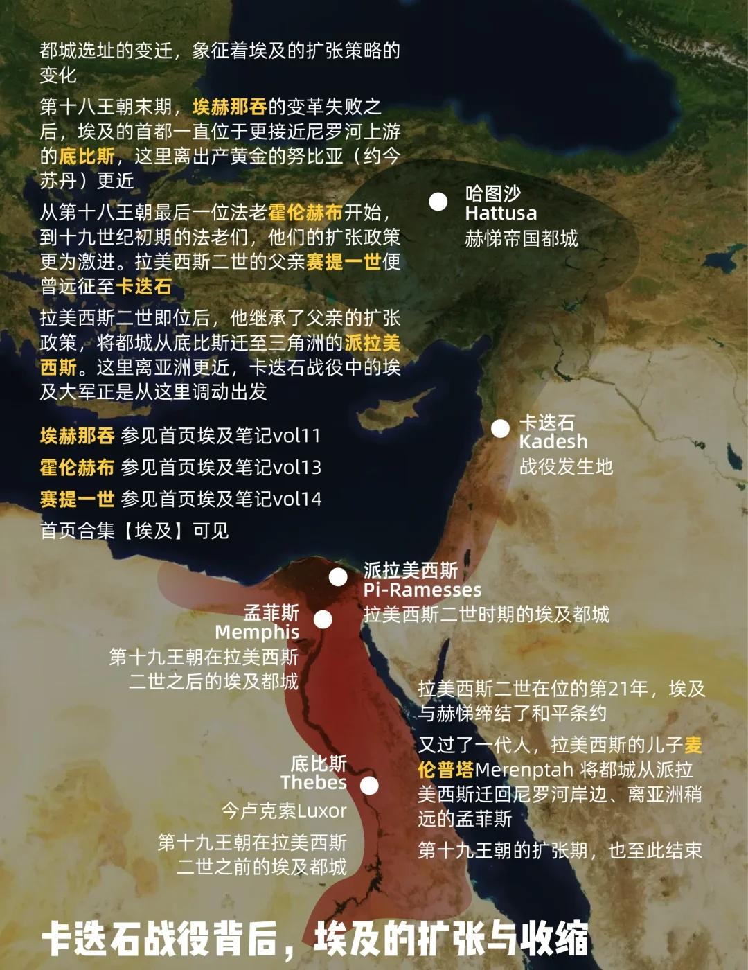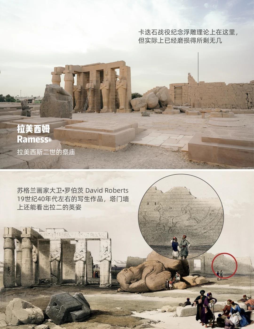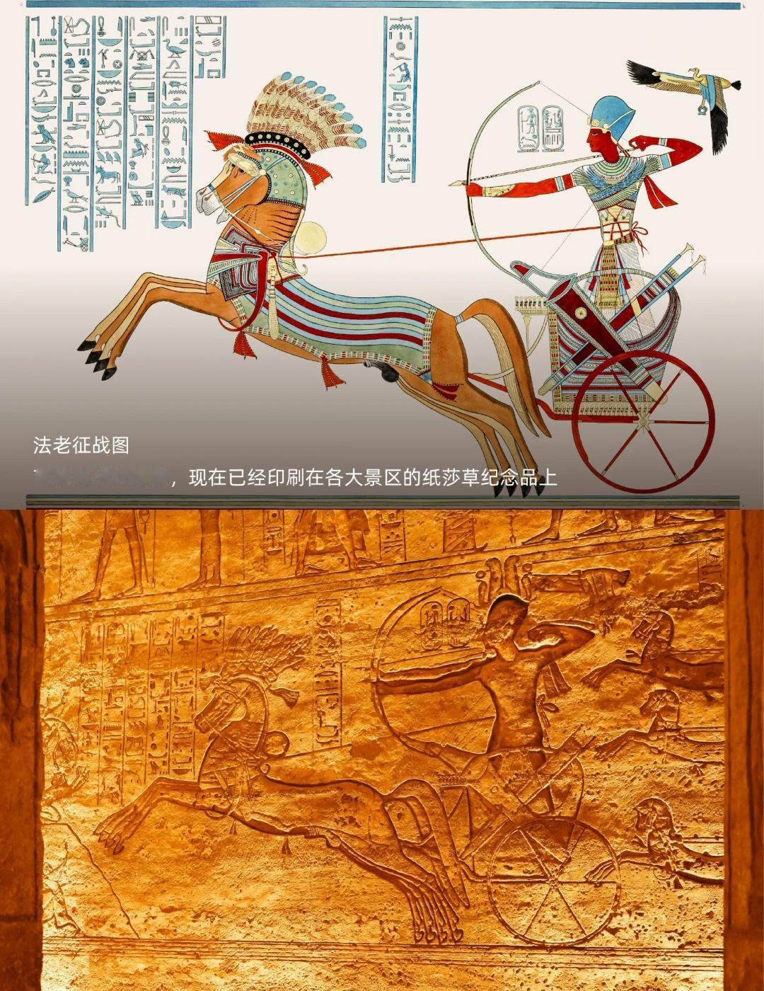 拉美西斯二世,埃及的极盛之下是什么 拉美西斯二世恐怕是埃及知名度最高的法老,在位66年,纪念建筑遍布埃及 . 在他的纪念建筑之中,最有代表性的场景,是卡迭石战役 battle of kadesh . 卡迭石位于古埃及同期的几大帝国边界地带,宗主随着帝国势力的此消彼长而改换。到了十九王朝初期,与古埃及在此争锋的,则是赫悌帝国Hittite Empire。他们的统治中心远在安纳托利亚半岛,如今土耳其所在的地方 . 拉美西斯二世年幼时,曾随父亲赛提一世曾远征至卡迭石。在这场战争中,埃及一方攻克卡迭石后撤离,而赫梯重新夺回了城池 . 拉二即位的第五年,他再次发动了一场亚洲远征;其中的卡迭石战役,则是两大帝国在各自国土边缘的战争中,一场本该无关痛痒的一次较量——赫悌一方的年鉴甚至没有对这场遭遇战的详细记录 . 关于这场战役的几乎全部记述,都来自于埃及一方 . 这场战役,埃及一方甚至不能算是打赢了。目前学者们倾向于认为,埃及与赫悌双方打成了平手 . 不过,没打赢也不要紧,拉二或许不是最骁勇善战的法老,但绝对是最深谙传播学之道的法老: . 在描绘卡迭石战役的壁画和浮雕之中,拉二或驱动战车,或持槌肉搏;女性神祇化身为鸟,在上方保佑着他;男性神灵则将武器递到他手中。法老本人威风凛凛,不可侵犯 . 至此,个人的胜利成为战略的胜利。至于并未真正打赢的战役、并未真正夺回的卡迭石,无人深究。 . 今天的游客们看到的拉美西斯二世,也和三千年前的平民们所看到的一样: . 万物万象,无所不能 . 大即是美 埃及乾隆 历史与文化