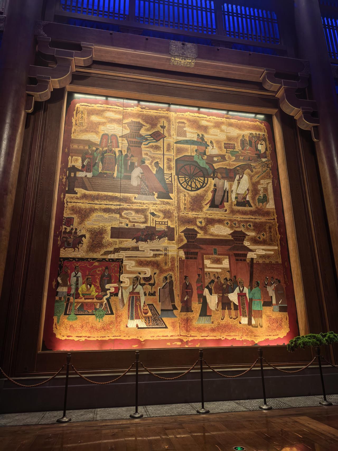 在曲阜“尼山圣境”园区最为引人注意的,当属七十二米高的孔子铜像,他建在小区的中轴线上,身高表明他的年龄,背山面湖,稍稍偏东9.5度,象征着孔子享受九五至尊的待遇,两侧山体种植了三千棵杏树,寓意着孔子的三千弟子,贤者七十二人。 室内游从“大学堂”开始,它依山而建,整体呈方台式形,是古典东方文化的集大成者动线。单体建筑气势磅礴,正门肃穆含蓄中自带威压,中式庭院式水景。侧门跟随人群鱼贯回廊,经过一个简单的厅堂便是七十二贤廊,泥塑人物栩栩如生,其创作的背景来自《论语》故事里孔子七十二学生的故事。西侧墙上巨幅油画,先生树下讲学,学生姿态各异,有讨论者、倾听者、诵读者、作揖者共七十人,唯缺“你、我”二人我们都是孔子的学生。 大殿正中高悬“高山仰止”匾额,“高山仰止,景行行止。虽不能至,心向往之。”司马迁用此句表达对孔子的敬仰,他的道德和学问,如巍峨高山令人仰望,如光明大道让人遵循。而“天不生仲尼,万古如长夜”,更是将孔子比作照亮黑暗的明灯,没有他,华夏文明或许会在蒙昧中徘徊更久。阔步而上,两侧祈福灯各种铜制仿古灯器对称放置,奢华古典。 仁、义、礼、智、信五厅,以仁厅为中心,突出儒家文化中“天下归仁”的仁政思想。四周墙壁隔断上摆满蓝皮黄页书籍,记载着儒家思想的深邃内涵。置身其间,我仿若穿越时空,与孔子及其弟子们进行了一场跨越千年的对话。儒家讲堂可供游人研修实践,我正襟危坐认真手书《论语》不能愧对于孔子学生称号。 其他四厅廊柱、穹顶各异,融合了殿、堂、厅等传统建筑形式,立志建成既饱含充盈传统文化元素,又极具创新精神的传世文化建筑杰作。 《金声玉振》大型艺术表演,声光电现代化道具与传统文化融合很震撼,虽说140元的票价有点小贵,我说贵的值,开场首先观众、演员起立正衣冠,拱手作揖仪式感拉满,此剧讲述了孔子的一生,从击钟(金声)开始,到学术成就以击磐(玉振)告终。赞颂孔子对文化的巨大贡献。 走出大学堂,夕阳余晖洒在山顶,橘色的暖阳映于湖上,染黄了大片水域,群山环抱暮云,回首望去,孔子铜像在余晖中更显庄重。先生的思想,历经两千多年的风雨洗礼,依然熠熠生辉,滋养着一代又一代的华夏儿女。它不仅是中华民族的精神瑰宝,更是世界文化宝库中的璀璨明珠。 作为我、我们更加坚定了传承和弘扬优秀传统文化的信念。