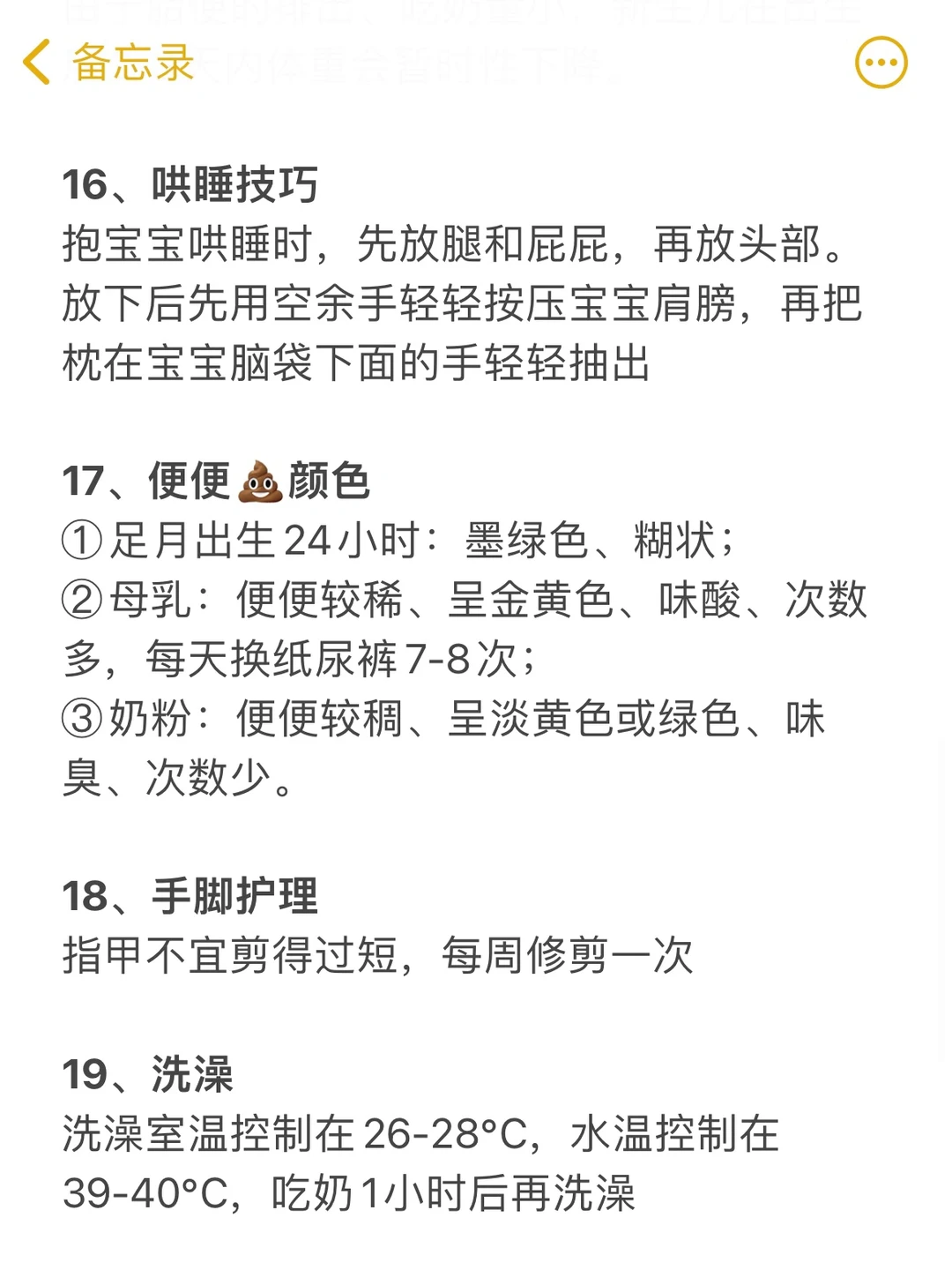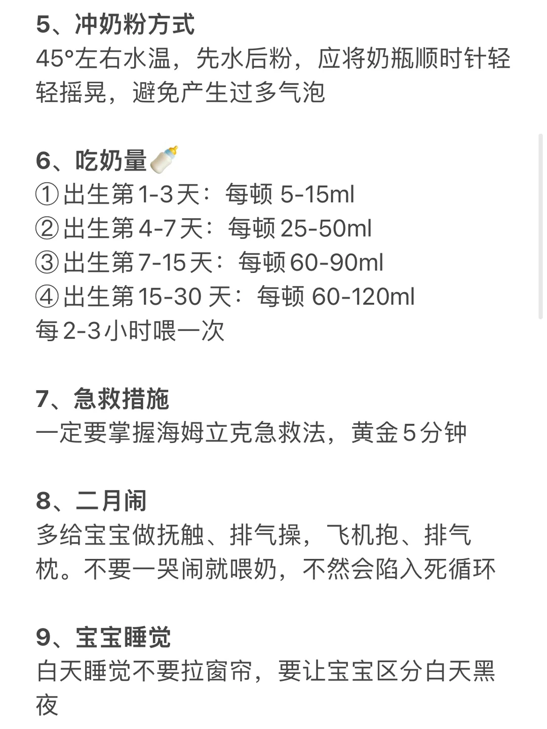 . 月嫂的经验分享 希望能帮助到所有新手爸妈 . 1、产后开奶 2、宝宝吸吮 3、喂养姿势 4、拍嗝 5、冲奶粉方式 6、吃奶量 7、急救措施 8、二月闹 9、宝宝睡觉 10、抱娃姿势 11、前2个月侧睡 12、宝宝打嗝 13、家庭环境 14、判断冷热 15、体重下降 16、哄睡技巧 17、便便颜色 18、手脚护理 19、洗澡 …… 字数有限,具体看图 . 👉想知道每个月龄的宝宝护理 👉请看我的上一篇笔记 . 我会持续更新孕育干货 关注我,新手妈妈带娃不迷路