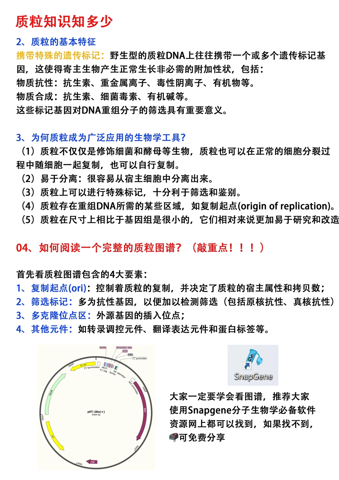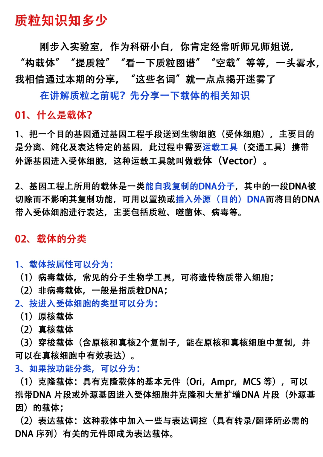 刚步入实验室,作为科研小白,你肯定经常听师兄师姐说,“构载体”“提质粒”“看一下质粒图谱”“空载”等等,一头雾水,[失望R] 主要从以下五个部位进行分享 1⃣️什么是载体 2⃣️载体的分类 3⃣️什么是质粒?具有哪些特征? 4⃣️如何阅读一个完整的质粒图谱 5⃣️如何改造一个质粒 [种草R]本期科研软件分享—SnapGene ,一款分子生物学常用科研软件[赞R] [彩虹R]满满的干货与tips ,我相信通过本期的分享,“这些名词”就一点点揭开迷雾了[派对R],欢迎大家讨论交流呀