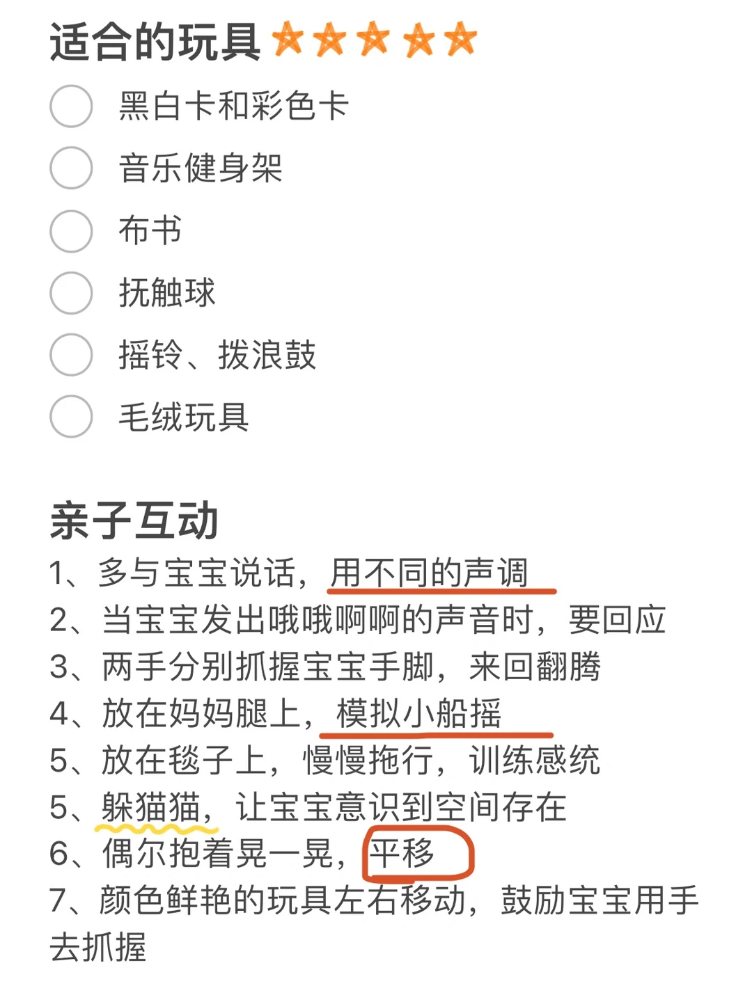 . 宝宝第2个月,很多新手妈妈刚从月子中心❤回了家,开始独立面对各种情况,不知所措😰。以上一些2月龄的宝宝护理建议,希望能帮到你们。 . ⭕️适合2月龄👶🏻玩具 👉黑白卡和彩色卡 👉音乐健身架 👉布书 👉抚触球 👉摇铃、拨浪鼓 👉毛绒玩具 --------------------- [飞吻R]1月龄新生儿护理 [飞吻R]请看我的上一篇笔记 . 我会持续更新孕育干货 关注我,新手妈妈带娃不迷路