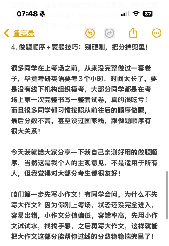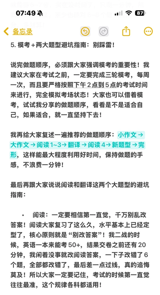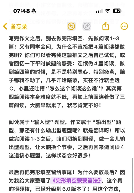 没完整模考过的同学容易吃亏!推荐高分顺序:小作文→大作文→阅读1-3→翻译→阅读4→新题型→完形。小作文先试水,避免大作文开篇出错;阅读拆着做,连续4篇易疲惫;完形放最后,用《完形填空蒙蒙答法6.6.0版》,3-5分钟能对7-13题,性价比超高,没时间也能捡3-4分。
