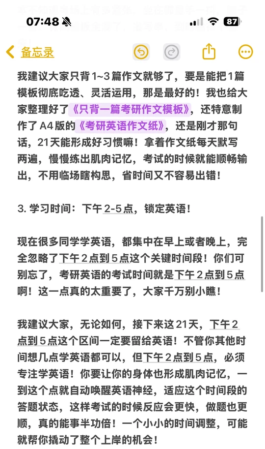 考研英语考试时间是下午2-5点,别再只早晚学英语了!接下来21天,不管其他时间怎么安排,下午2-5点必须专注学英语,让身体形成肌肉记忆,一到这个点就切换“英语模式”,考试时反应更快,事半功倍。