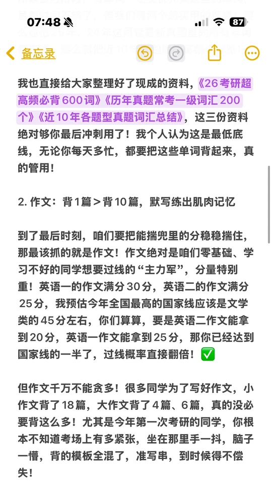 英语三天不学就忘,最后阶段别瞎刷APP或单词本了!脱离语境背单词,上午背下午忘,纯属白费功夫。优先攻克真题词汇:要么吃透24/25年两套真题所有单词,要么背近10年高频词。我整理了《26考研超高频必背600词》《历年真题常考一级词汇200个》《近10年各题型真题词汇总结》,这是最低底线,再忙也要背!
