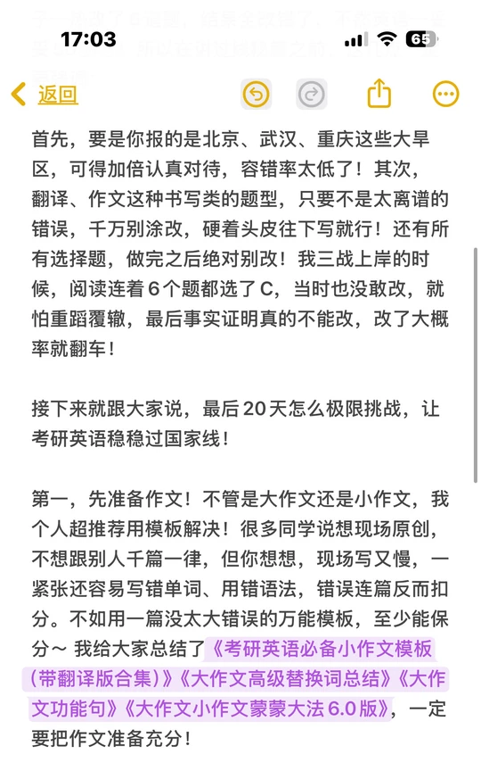 1. 作文优先备模板!现场原创又慢又易出错,不如用《考研英语必备小作文模板(带翻译版合集)》《大作文高级替换词总结》《大作文功能句》《大作文小作文蒙蒙大法6.0版》,保分效率高。