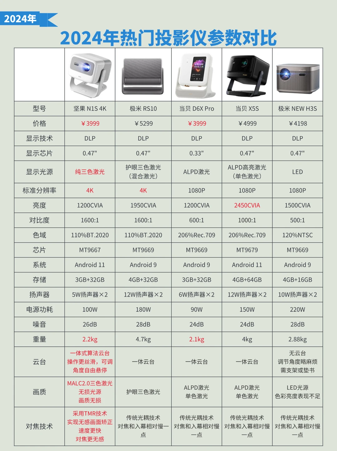 五款投影仪各有优点,当然,如果想要性价比和更好的观影体验兼得,坚果N1S 4K是个不错的选择,不到4千拿下近万元4k+纯三色激光的高端投影才有的配置,还支持自动对焦、画面矫正等功能。一体式算法云台,实现无极对焦,可调节角度和自由悬停。