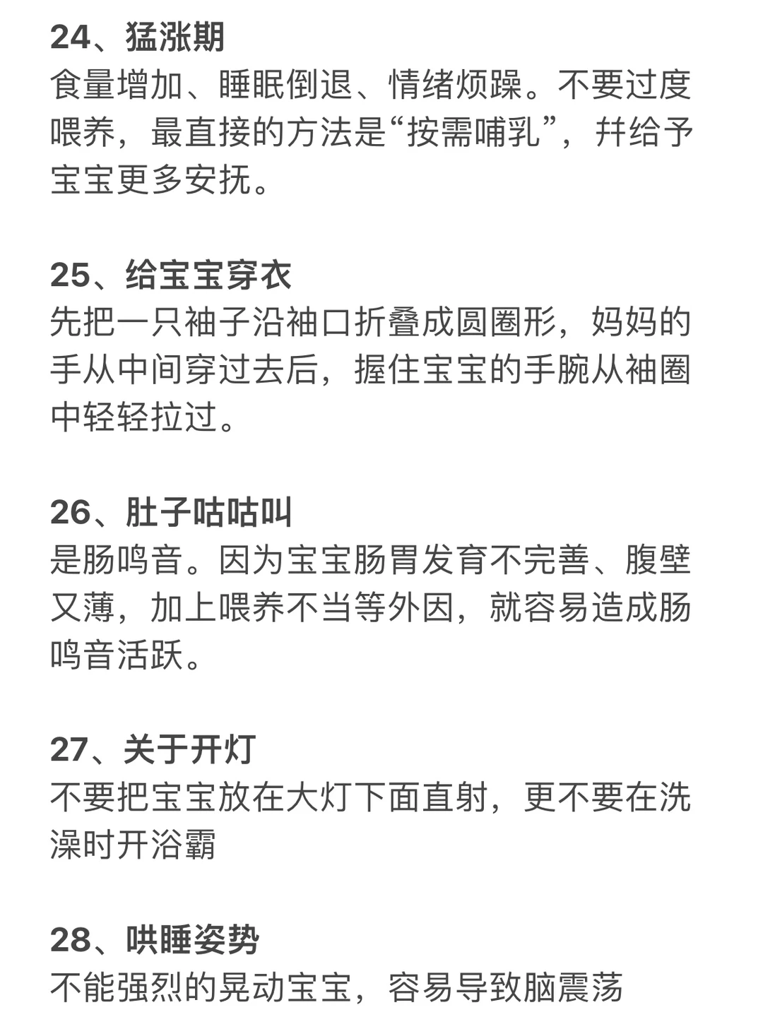 . 接上一篇 月嫂的经验分享 希望能帮助到所有新手爸妈 . 20、口水疹 21、新生儿头垢 22、肠胀气 23、腿纹不对称: 24、猛涨期 25、给宝宝穿衣 26、肚子咕咕叫: 27、关于开灯: 28、哄睡姿势 29、呛奶 30、宝宝发烧 31、粑粑有酸臭味 32、擦屁屁霜 33、宝宝便秘 34、攒肚 …… 字数有限,具体看图 . 👉想知道每个月龄的宝宝护理 👉请看我的上一篇笔记 . 我会持续更新孕育干货 关注我,新手妈妈带娃不迷路