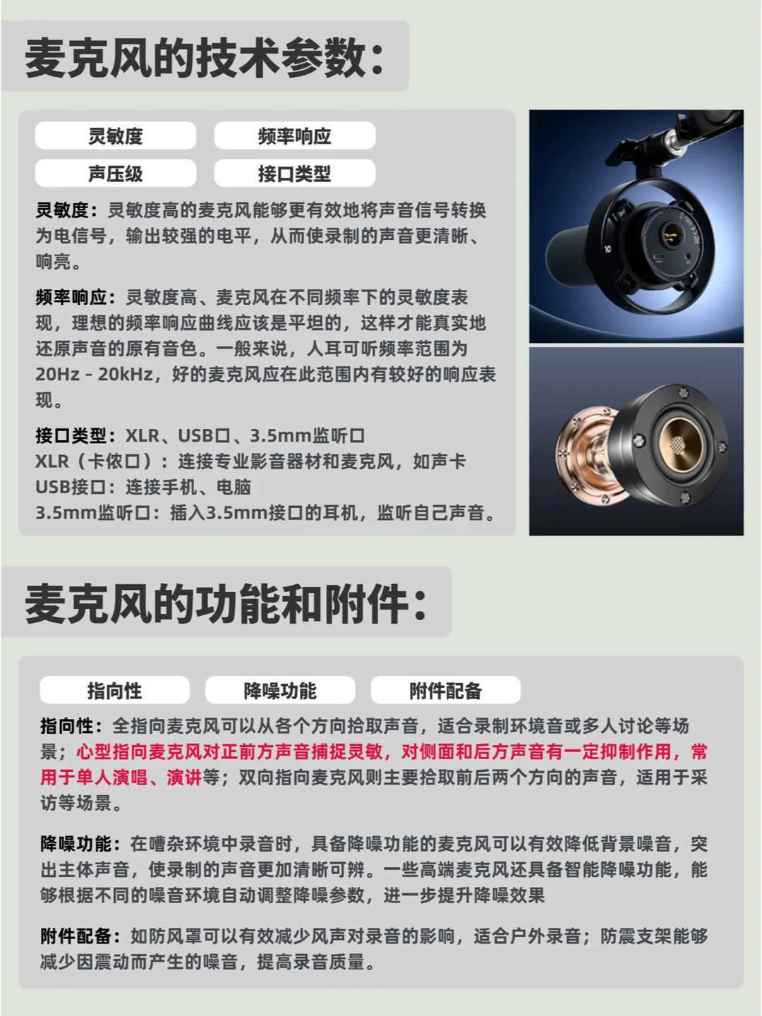 🎤指向性:全指向麦克风可以从各个方向拾取声音,适合录制环境音或多人讨论等场景;心型指向麦克风对正前方声音捕捉灵敏,对侧面和后方的噪声有一定抑制作用,常用于单人演唱、演讲等;双向指向麦克风则主要拾取前后两个方向的声音,适用于采访等场景。