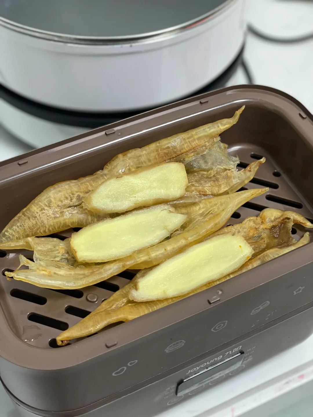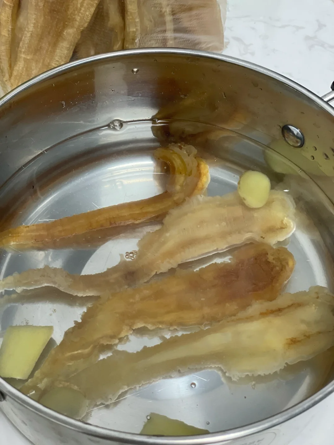 泡发了几条花胶在盒马鲜生买了个椰子鸡套餐 套餐:2个椰青,1只鸡,酱油调料。 小周末在办公室随便弄个火锅吃吃[害羞R] 花胶泡发:花胶洗干净,配合姜片水烧开后蒸8分钟焖5分钟。浸泡在纯净水中放置冰箱冷鲜层泡发24小时即可。