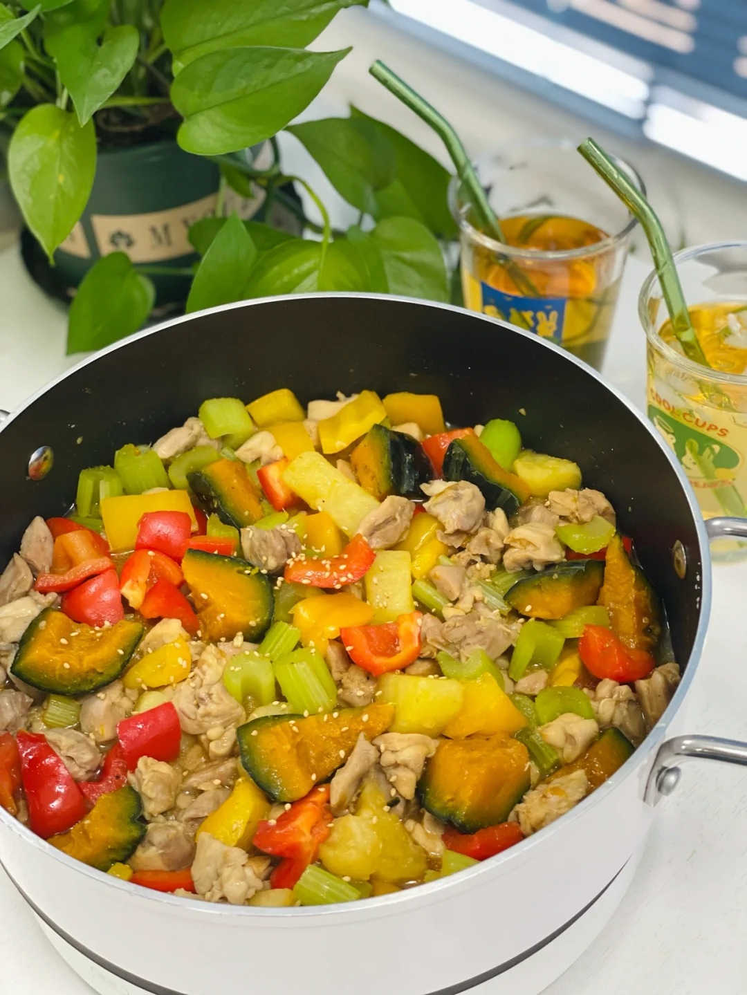 一锅里面包含了碳水,维生素,蛋白质。 碳水:土豆,贝贝南瓜 维生素:西芹,红黄彩椒 蛋白质:去皮鸡肉块