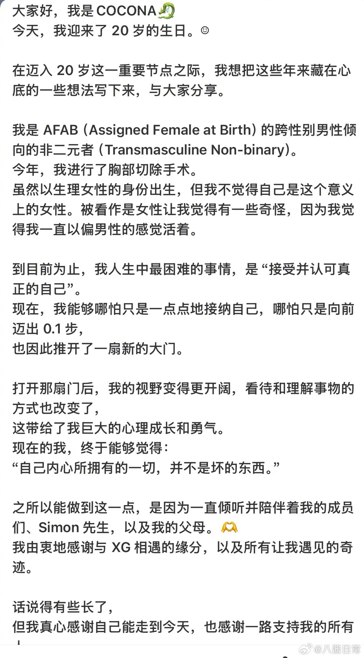 XG成员cocona做了胸部切除手术,宣布非二元跨性别身份。cocona表示从出生开始就被当做女性对待,但自我不认同是是女性,被当成女性有种强烈的不协调感,自己一直以偏男性的感觉活着