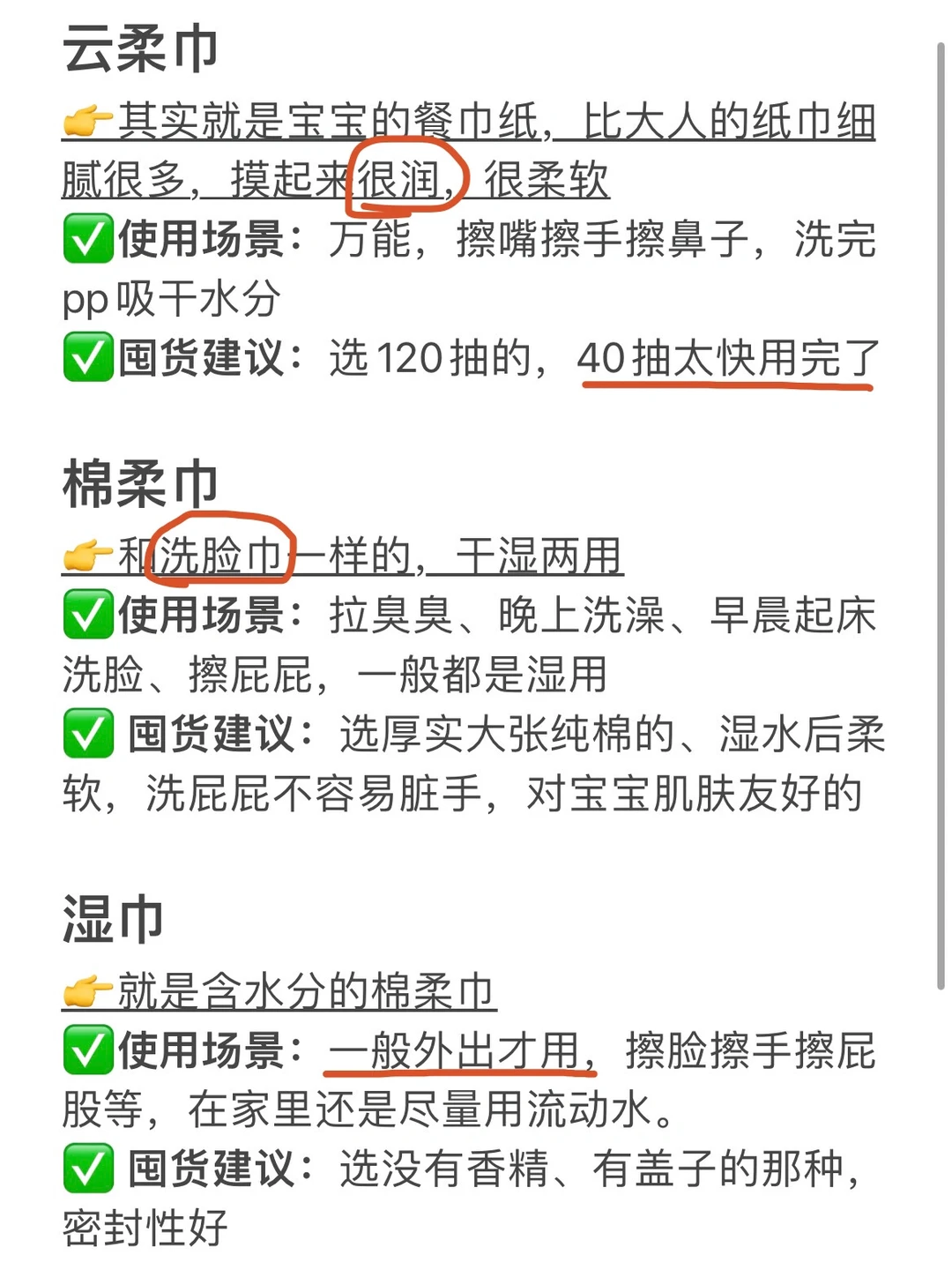 . 刚生完,新手妈妈对宝宝的纸品一无所知? 今天一篇全告诉你 孕期囤货不踩雷! . ⭕️关于用量 云柔巾>棉柔巾>湿巾 . ⭕️我的使用情况: 云柔巾(40抽):一天基本2包起 棉柔巾(100抽):一包2-3天 湿巾:用量较少,看出门情况 注:用量仅供参考,每个人的使用习惯有所不同哦 . 👉想知道产后每月龄宝宝如何护理 👉请看我的上一篇笔记 . 我会持续更新孕育干货 关注我,新手妈妈带娃不迷路