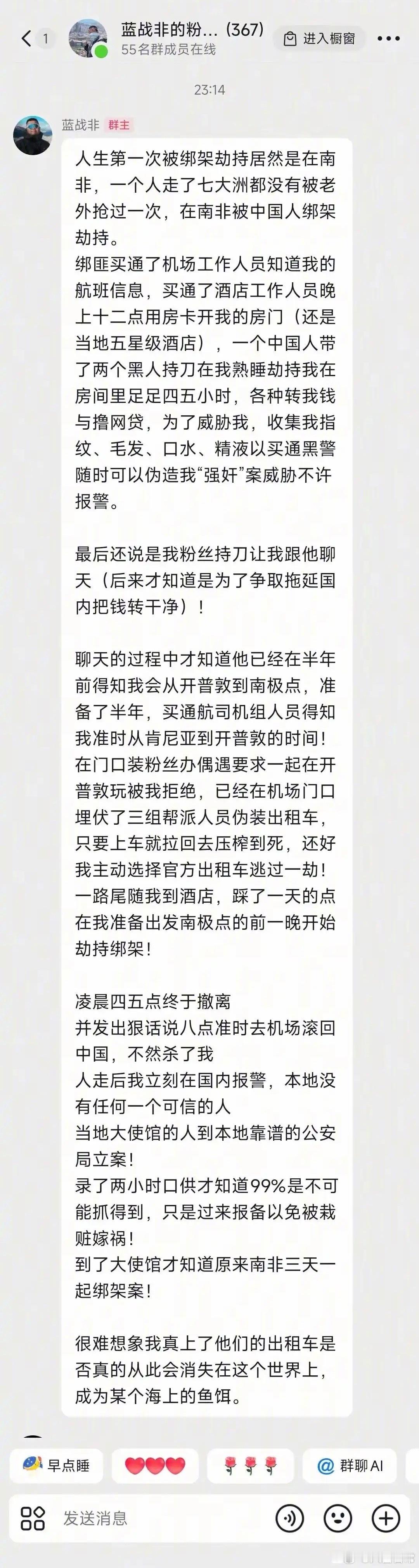 Jocey 2 2025-12-09 21:01 就是遇到仙人跳了,或者真把别人给强了。绑架,勒索300万,可能吗?在国内都不可能,更何况南非这种无法无天的地方。绑架300万,还得给国内转账的钱,买通人的钱,真到手200万都难。为啥不,拉出酒店,再勒索几天,把所有银行卡都爆出来。再向家人要钱。大部分难的事都干完了,反而是轻松的部分不进行到底?