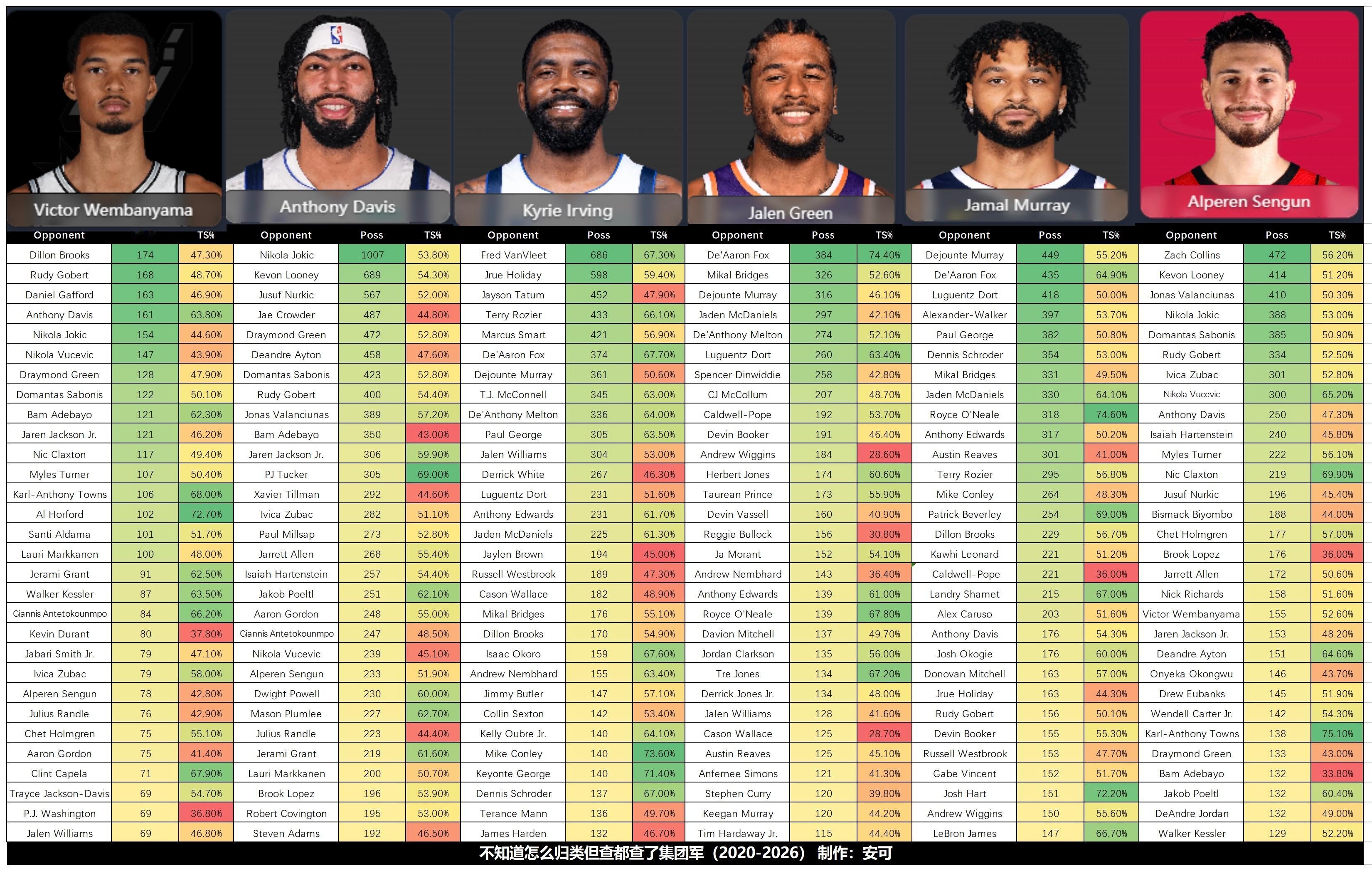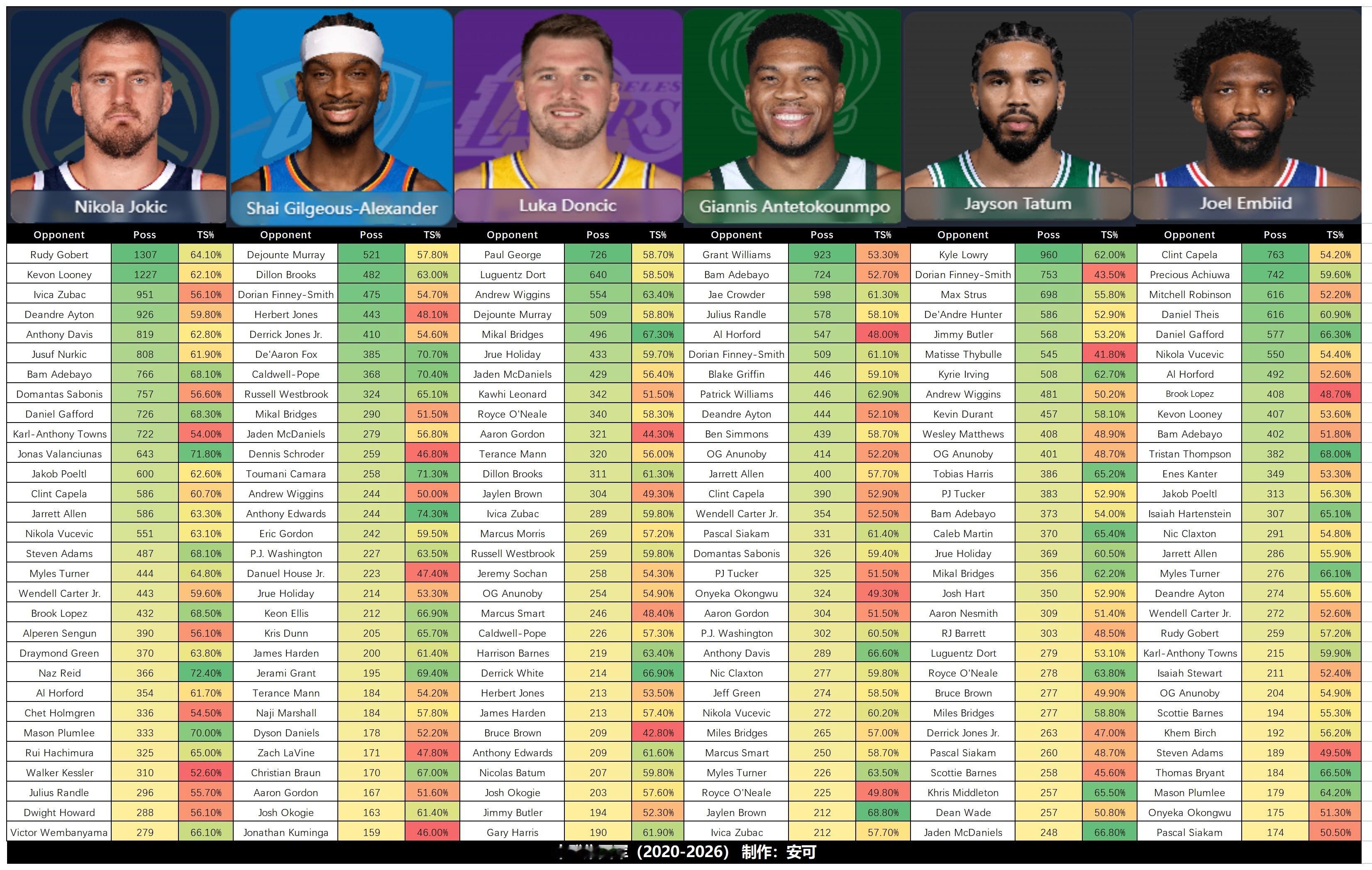 谁是谁最严厉的父亲?谁又是谁最孝顺的大儿?EXCEL球迷,堂堂登场!让我们来看看十八名球员在过去七年间面对的防守人,以及对应的进攻效率,这正是对线中最口水的话题之一。1.解释:POSS(总回合数),TS%(真实命中率)2.抓取赛季:2020-2026老登尾巴,中登巅峰,小登青涩。3.需要注意的问题:Databallr并未给出统计方式的官方定义——也可能是我没有找到——但出具了每一个回合的蓝光录像溯源,点击即可查看。我猜测依然是类似降准/干扰投篮的摄像机抓取,记录你出手/上篮时距离你最近的防守人/对位者。因为你可以看到约基奇上了库里防守人榜单,录像中可以看到很多的护框/外扩干扰投篮回合。这样的数据有局限性么?当然。他可能无法反映具体的策略,投入的防守资源,同伴的协防帮助,等等等等。但他依然有巨大价值。这彰显了一种正确的数据观:数据是“现象”,而不是“结论”,也不负责给出“结论”。给出“结论”的过程是我们诠释数据的过程,现象和结论之间会有真空地带,连接真空需要用思考和“看球”为桥梁。二者不可偏废。而Databallr恰好给了你验证途径。狄龙才是文班终结者?布罗格登怎么防哈登这么好?库里为什么暴打多尔特然后被小里弗斯搞了?戈登防勒布朗防得不错,很正常……怎么是这个戈登?快使用它吧。Play by play录像在很多地方可是付费内容。4.所用网站:网页链接是的,除了这个数据比较好玩,我的目标是再次向大家推荐这个简洁明快,功能强大的免费网站,并且直接帮你们调到了pvp界面,具体使用方式和功能拓展请参照网页链接Just do it!5.宇宙安全声明:实践检验真理,欢迎进入网站审阅数据或拓展更多功能。图片仅供娱乐使用,如有错误概不负责。