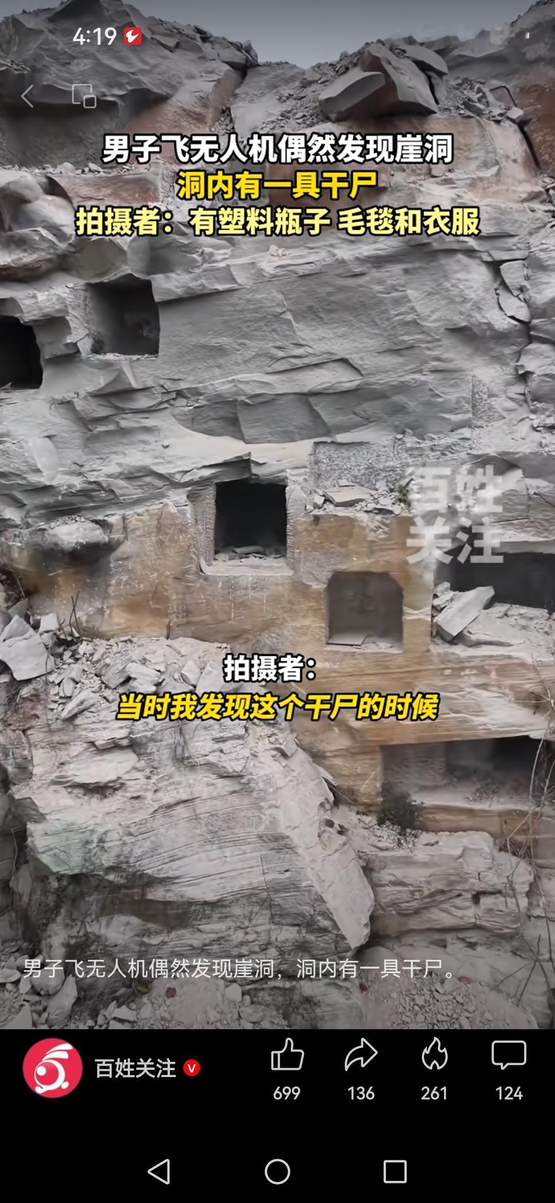 哎,你说这事儿闹的,真是让人心里五味杂陈。重庆一哥们儿,网名叫“淘二娃”,闲着没事拿无人机在山里头瞎飞找找灵感,结果镜头一扫,好家伙,在那半山腰的崖洞里,竟然发现了一具干尸! 这哥们儿当时手都麻了,说实话,换谁谁不懵啊?一开始还以为是啥野兽尸体或者假人,定睛一看,五根手指头,人脑袋轮廓,这哪是假的啊!旁边还散落着塑料瓶、旧毛毯、破衣服。这画面,光是听着就让人头皮发麻。 但这事儿最让我感慨的,不是这惊悚的发现过程,而是科技和人性的那点事儿。 你想啊,这崖洞在五六十米高的半空中,普通人根本爬不上去,要不是这无人机“多管闲事”飞上去瞅了一眼,这人估计还得在那洞里头待多少年,最后可能就真成“化石”了,连个身份都没人知道。 这科技啊,有时候就是这么神奇。它既能让你看到平时看不到的美景,也能让你揭开那些被遗忘的角落。这哥们儿发现之后,没想着拿这视频去网上博眼球,第一时间就报警了,这点必须得给个大大的赞!这才是咱们现代人该有的素质,敬畏生命,尊重法律。 更让人破防的是,视频发到网上没多久,竟然就有家属联系上了他。对方哽咽着说:“谢谢你,让我找到了爸爸。”原来这家人已经找了几个月了,一直没音讯。这一下,真是让人心里头酸溜溜的。这科技,这时候就不是冷冰冰的机器了,它成了连接生者和逝者的桥梁,帮着这家人了却了一桩心事。 不过话说回来,这事儿也挺让人唏嘘的。这人咋就跑到那崖洞里去了呢?是流浪汉?还是隐居者?或者是探险迷路的?现在警方还在调查,咱也不瞎猜。但想想也是,这大千世界,无奇不有,有些人就这么悄无声息地消失了,最后留下的,也就是那几个塑料瓶和旧毛毯了。 所以啊,咱们平时在享受科技带来的便利和乐趣的时候,也得时刻保持一颗敬畏之心。敬畏自然,敬畏生命,也敬畏那些我们未知的角落。这无人机飞手“淘二娃”这次算是做了一件大好事,让逝者能够安息,也让生者能够释怀。 这事儿也给咱们提了个醒,科技是把双刃剑,用好了能救人,用不好也能伤人。咱们在追求新鲜刺激的同时,也得守住底线,尊重他人,也尊重自己。