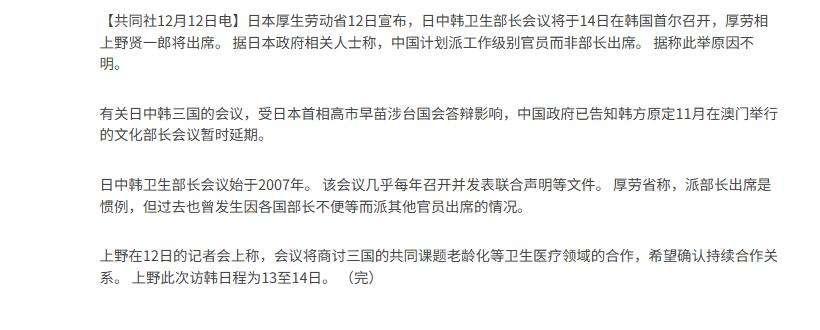 微妙时刻,中日韩将举行重要会议,中方出席人员,这次要打破惯例 这几天国际新闻里最热闹的,就是中日韩卫生部长会议了,听说14号在首尔开,消息一出来我就琢磨,现在中日关系这么僵,怎么突然又要开三边会谈,到底图个啥呢。 最近两个月事儿真多,高市早苗那番话刚消停没几天,日本战机又跑敏感区转悠,两边都给惹急了,原定的文化部长会直接取消,好几场双边会谈也卡着没下文,这时候突然提卫生合作,总让人觉得没那么简单。 日媒说中国这次只派了普通工作人员去,这事儿不太寻常,以前这种会,部长都得亲自来,现在降了级别,谁都能看出来意思,可卫生合作终究是救人的事,哪怕两边闹得再僵,真出了事也得搭把手,就像隔壁着了火,你再有气,也得拎水桶去泼。 中国这边态度很明确,高市早苗得先把那些话收回去,合作才谈得上,可日本那边好像并不打算认错,反倒把事往别处引,硬要把美国扯进来,最近曝光的国会答辩材料,明显是想跟高市早苗划清界限,这套手法他们用得挺熟了。 有意思的是,这些小动作反倒让中国更稳了,之前对日本那几招,现在看真管用了,高市团队最近悄悄去求美国帮忙灭火,说明他们自己也扛不住了,这场卫生会议更像是在试探,一边装出想合作的样子,一边却不给对方留余地。 说实话,这种级别的会谈想解决根本矛盾不太现实,但至少说明,哪怕外交上谈不拢,普通人的生命安全还是能先放一放,等这次会开完,两边说不定又能找别的事继续争,可卫生领域的合作总还留着一点火苗,这就够了。